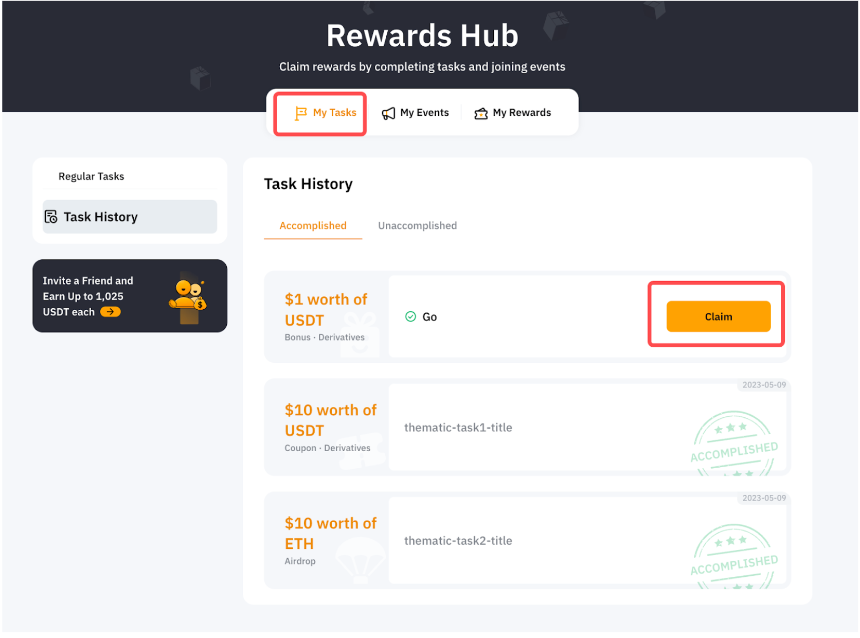 2o passo: Clique em Minhas tarefas e selecione Histórico de tarefas para resgatar seu bônus na seção Realizado.