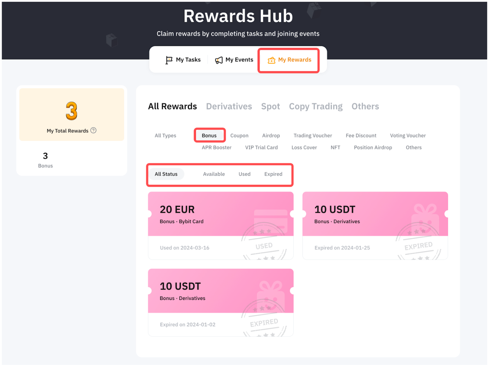 O bônus de derivativos pode ser usado de várias maneiras, como margem da posição, para deduzir taxas de corretagem ou custos de financiamento, e para compensar possíveis perdas incorridas na plataforma de trading da Bybit. Assim que o bônus for resgatado, ele será usado automaticamente antes do seu saldo disponível. Ao usar esses bônus, você pode melhorar sua capacidade de trading e mitigar possíveis perdas, fornecendo maior flexibilidade e recursos de gestão de risco.