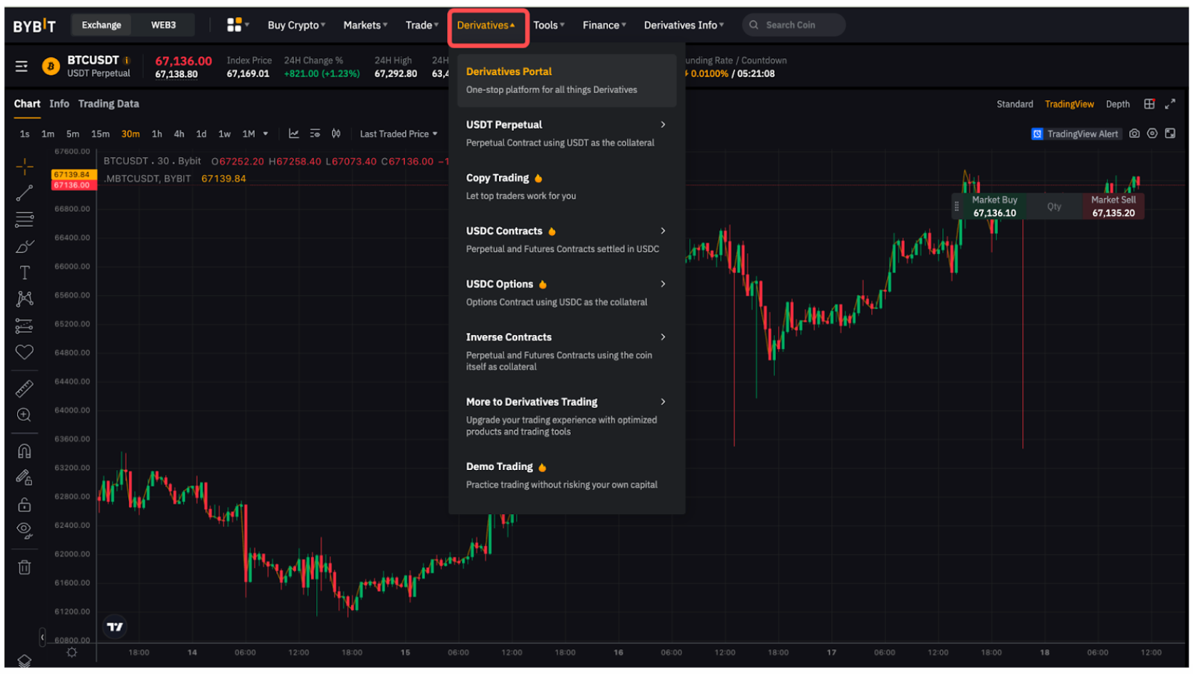 1o passo: passe o cursor sobre a guia Derivativos e clique no tipo de contrato desejado, o que levará você para a interface de trading correspondente.