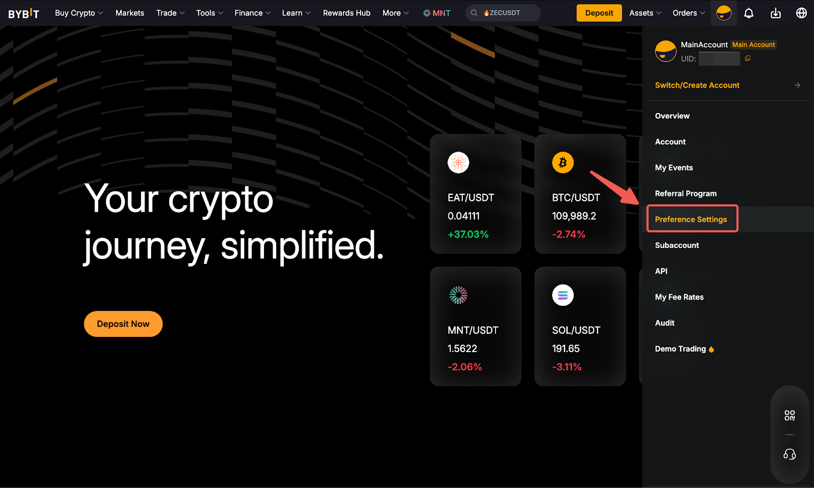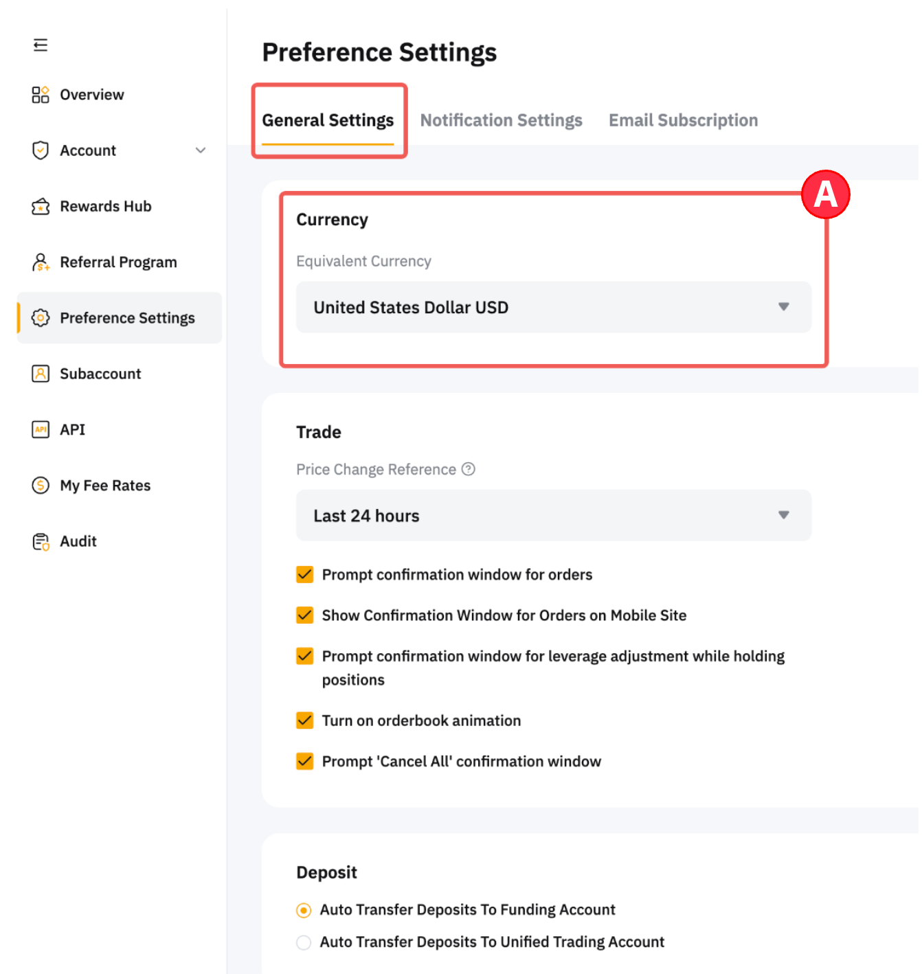 Selecione sua moeda preferida para exibição no site do Bybit na guia Configurações gerais. Esta moeda será usada para dar uma estimativa de seus fundos e valores de pedidos para entender melhor o valor em sua conta.