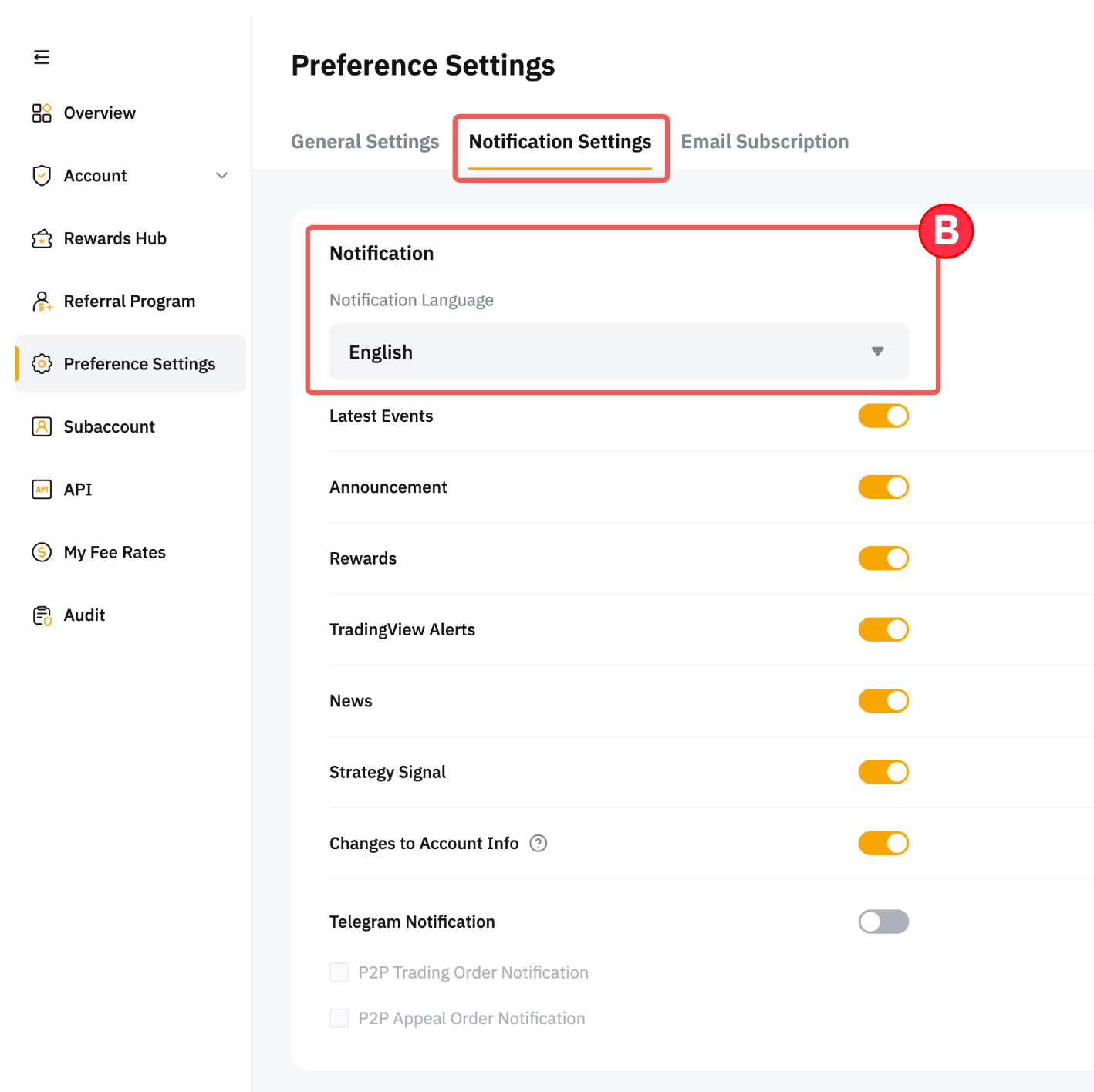 Selecione seu idioma de notificação preferido no menu suspenso na guia Configurações de notificação. Observe que esta configuração de idioma se aplica apenas às notificações por e-mail que você recebe. Para modificar o idioma do site ou notificações pop-up, consulte este guia.
