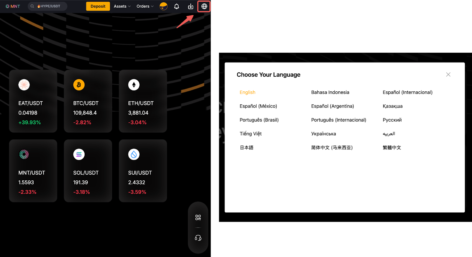 No canto superior direito do site, clique no ícone do globo para abrir a lista de idiomas disponíveis e selecione seu idioma preferido.