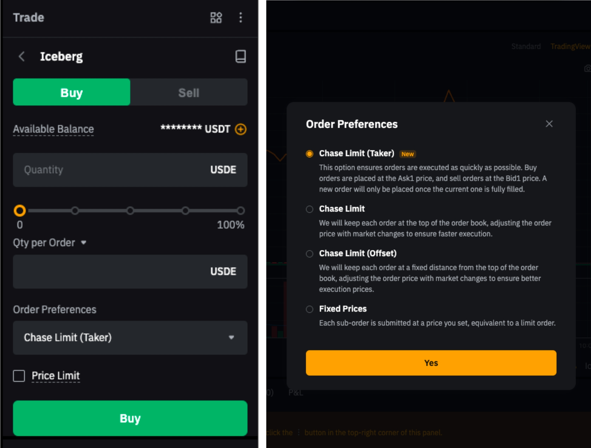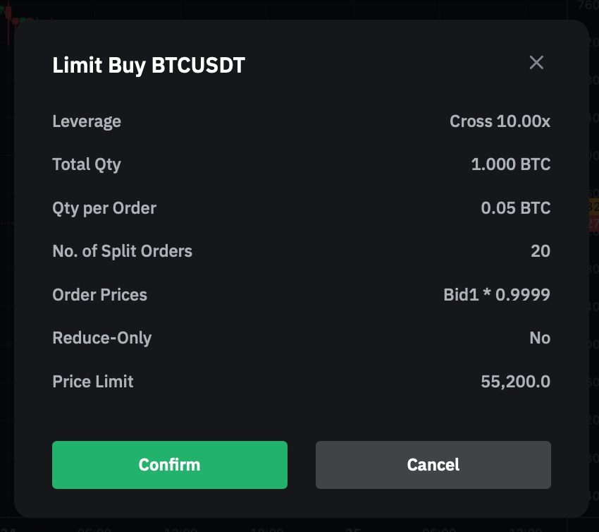 Há duas (2) configurações de divisão e quatro (4) opções de envio de ordens disponíveis para traders na Bybit.