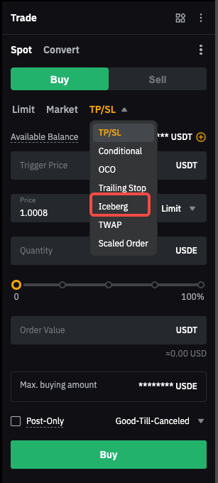 1º passo: Acesse a página de trading na qual deseja negociar e selecione Ordem iceberg.