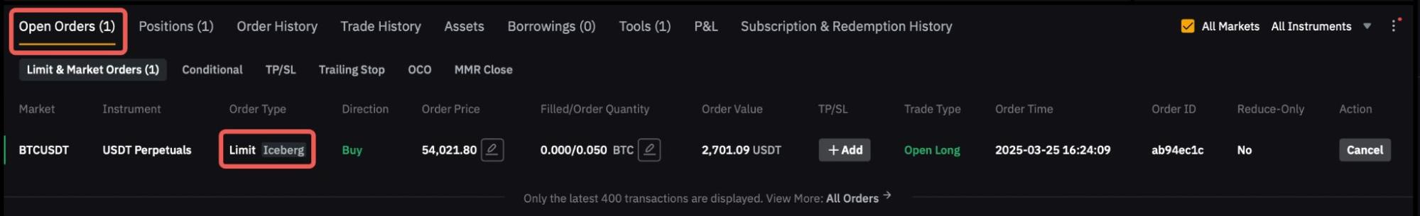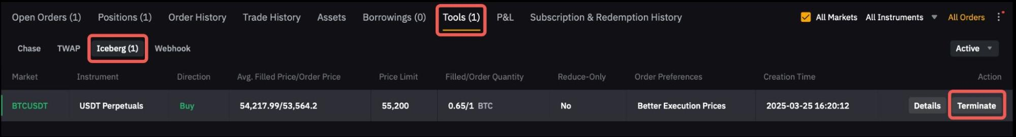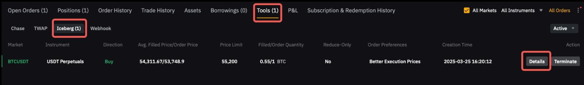 Visualize suas ordens atuais ou histórico de ordens tocando em Ferramentas e selecionando iceberg.