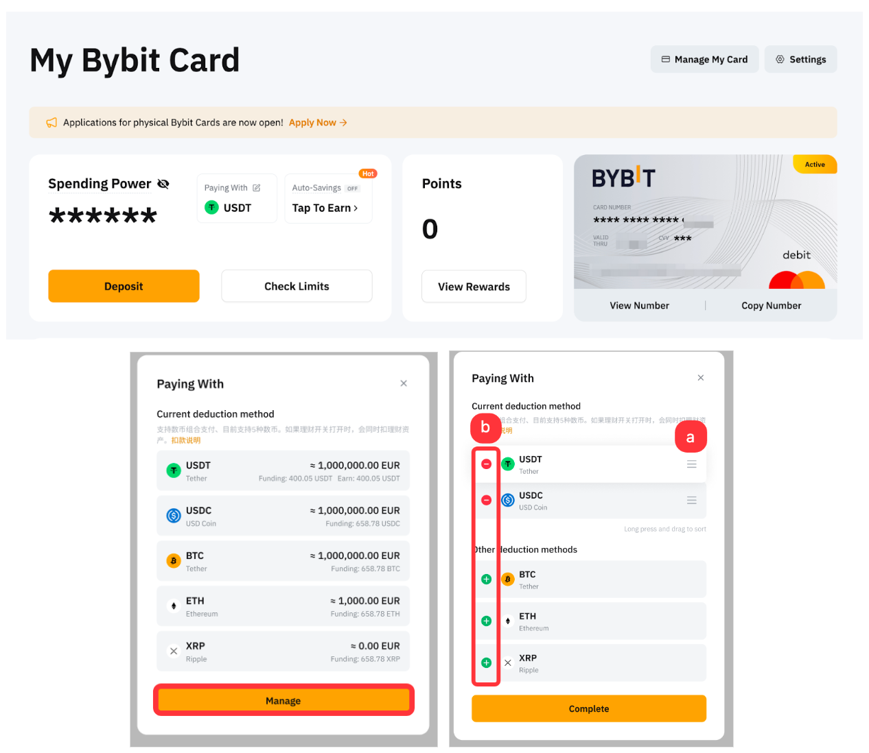 Você pode selecionar até 6 tipos de pagamento cripto para suas transações com cartão Bybit e a prioridade de pagamento padrão é USDT > USDC > TON > BTC > ETH > XRP. No entanto, você pode gerenciar suas moedas de gastos, incluindo adicionar, remover ou alterar o pedido na página Painel do cartão.