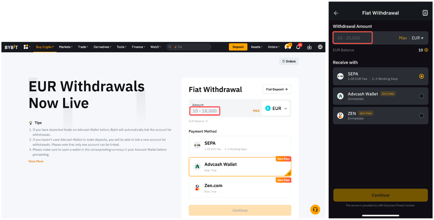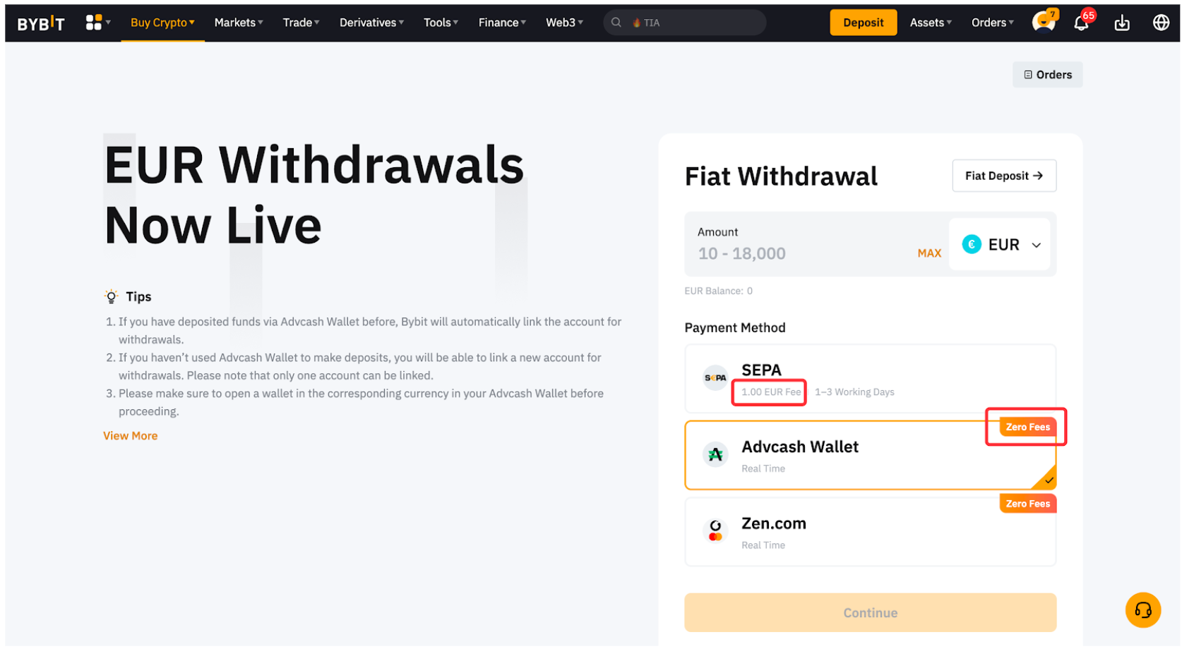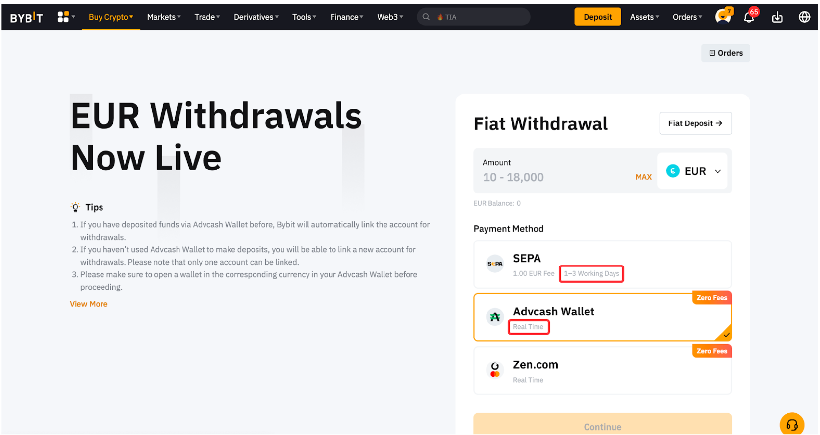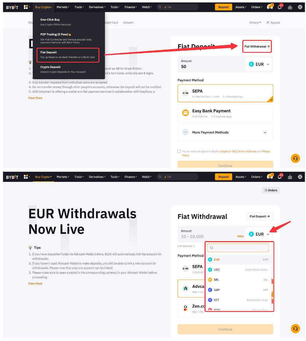 Apenas uma quantidade selecionada de moedas fiduciárias está disponível para saque na Bybit. Você poderá ver as moedas fiduciárias suportadas para saques em moeda fiduciária na página de Saques em Moeda Fiduciária.