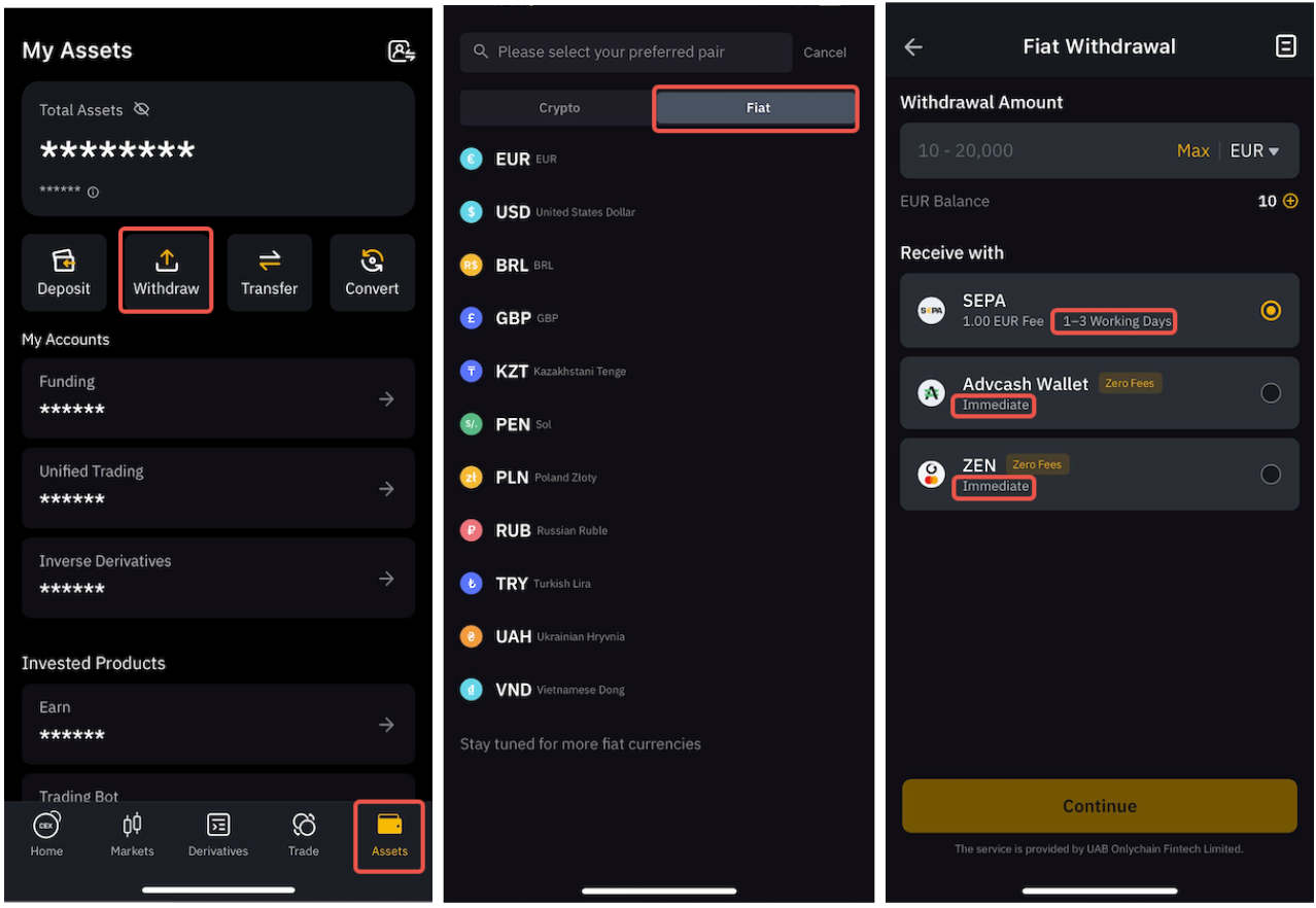 O tempo de processamento pode ser diferente, dependendo da moeda fiat e do método de pagamento selecionado. Você pode encontrar o tempo estimado de processamento para cada fiat indo até a página de retirada do Fiat e selecionando a moeda fiat de sua escolha. Leia também as dicas ao lado da janela de pedido para obter mais detalhes.