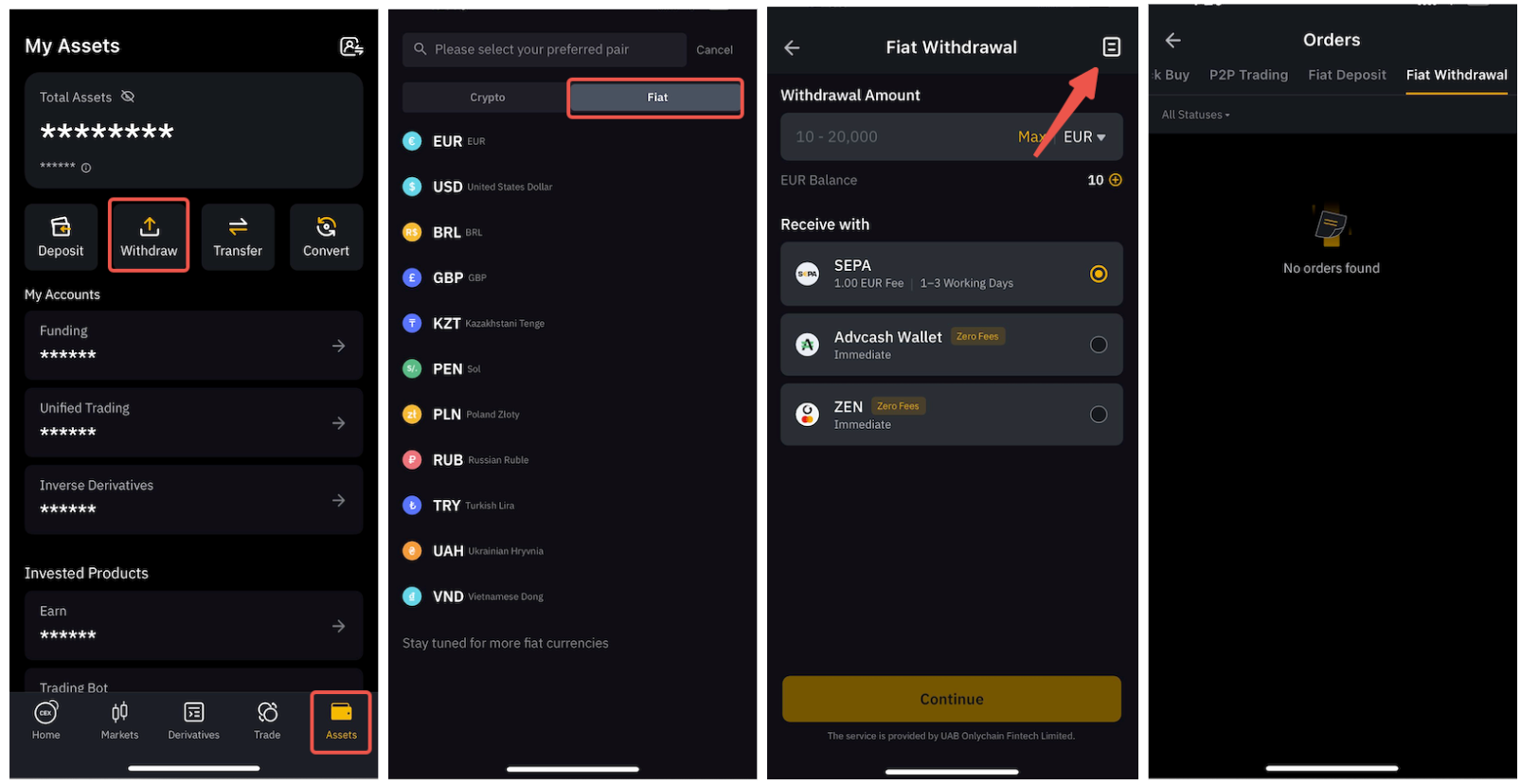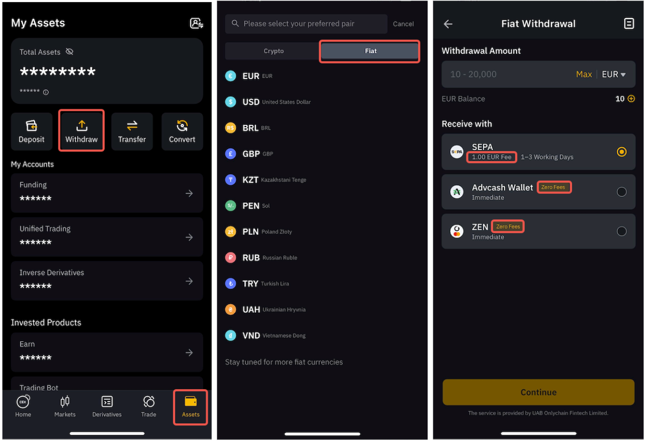 No aplicativo, vá até a aba Ativos e toque em Retirar, depois mude para a seção Fiat. Em seguida, toque na moeda Fiat e consulte as taxas associadas a cada forma de pagamento.
