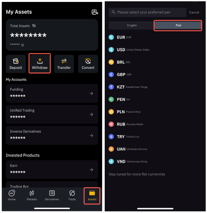 No aplicativo, vá para a guia Ativos e toque em Retirar, depois mude para Fiat → selecione qualquer fiat → toque no ícone da página.