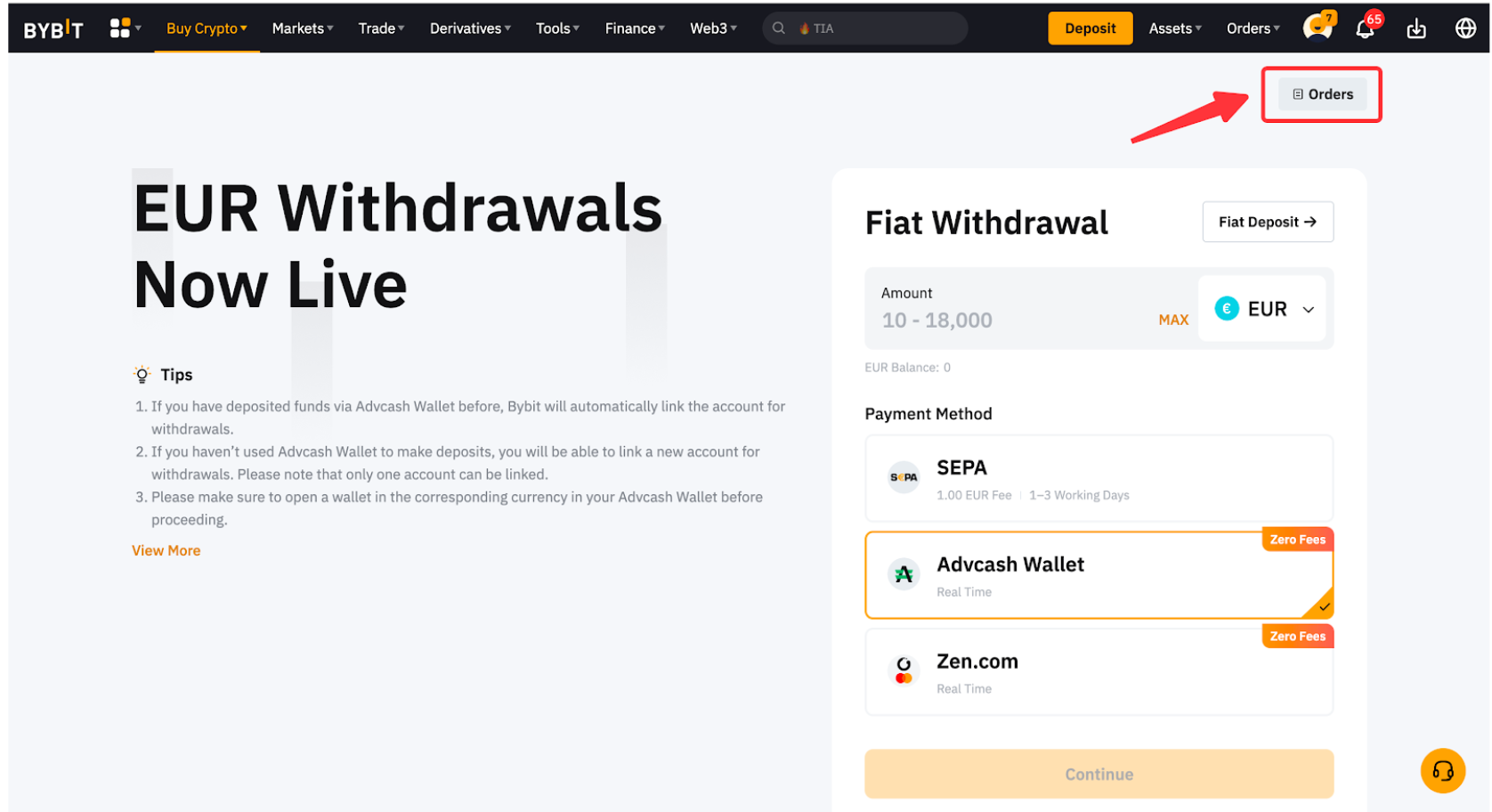 Para visualizar seu histórico de saques e obter mais detalhes, clique em Ordens, no canto superior direito da página Retirada Fiat.