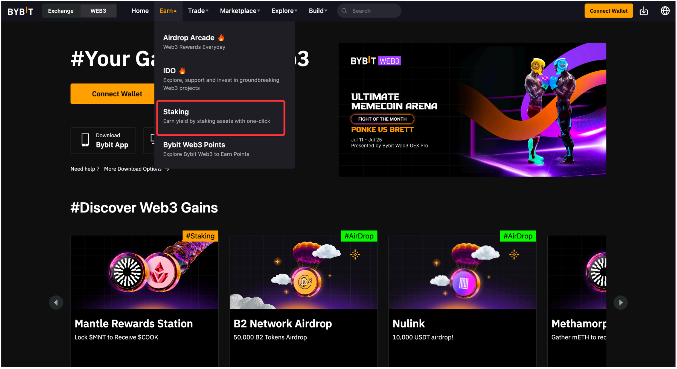Aqui está um guia passo a passo sobre como fazer seu primeiro staking na Wallet com a Bybit Wallet no aplicativo/no site. Antes de fazer staking, você terá que criar uma Bybit Wallet e depositar os tokens de staking desejados nela.