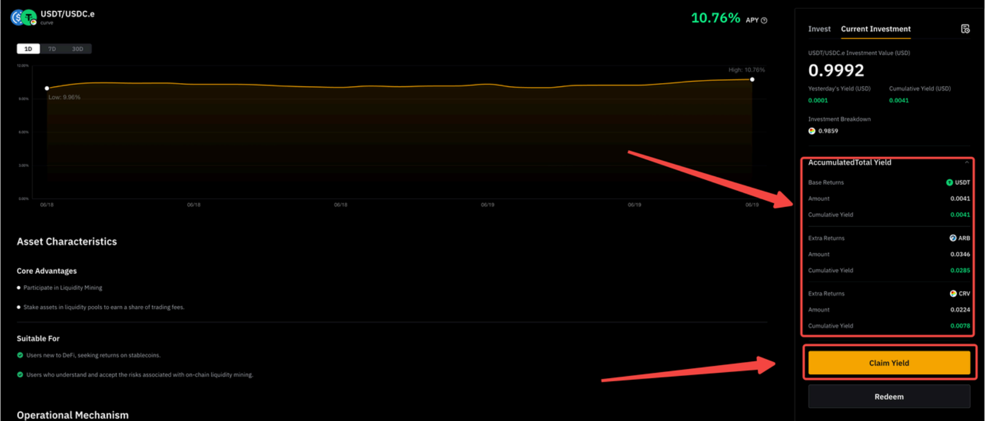 Observe que os detalhes do seu investimento também serão exibidos na respectiva página do pool de staking. Os detalhes incluem o rendimento total acumulado.