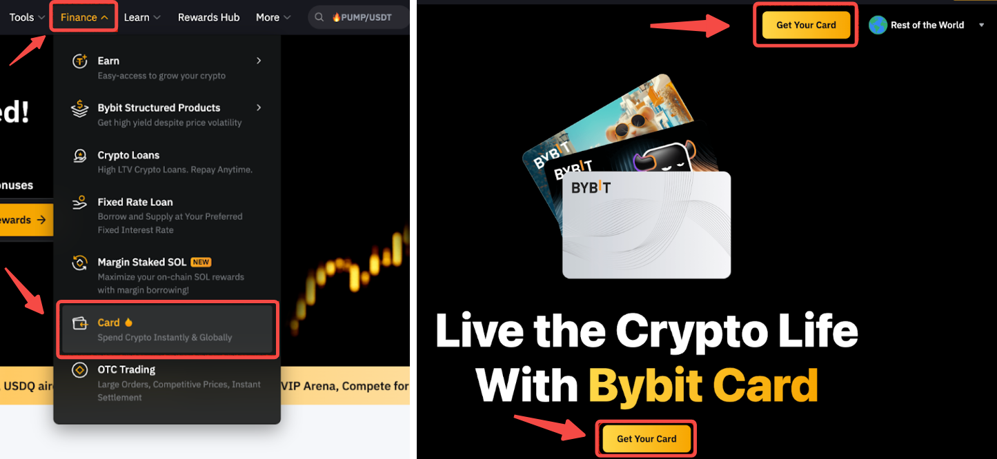 Step 1: Go to Finance → Card. Click Apply Now on the physical Bybit Card Application banner.