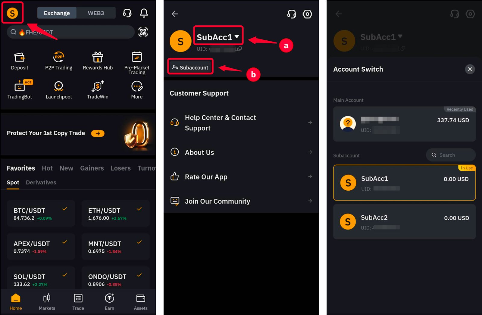 Method 3: Tap on your profile picture in the top-left corner of the homepage and open the Subaccount page. Locate the subaccount that you want to open and click on More → Account Switch and you will automatically log it to your selected subaccount.