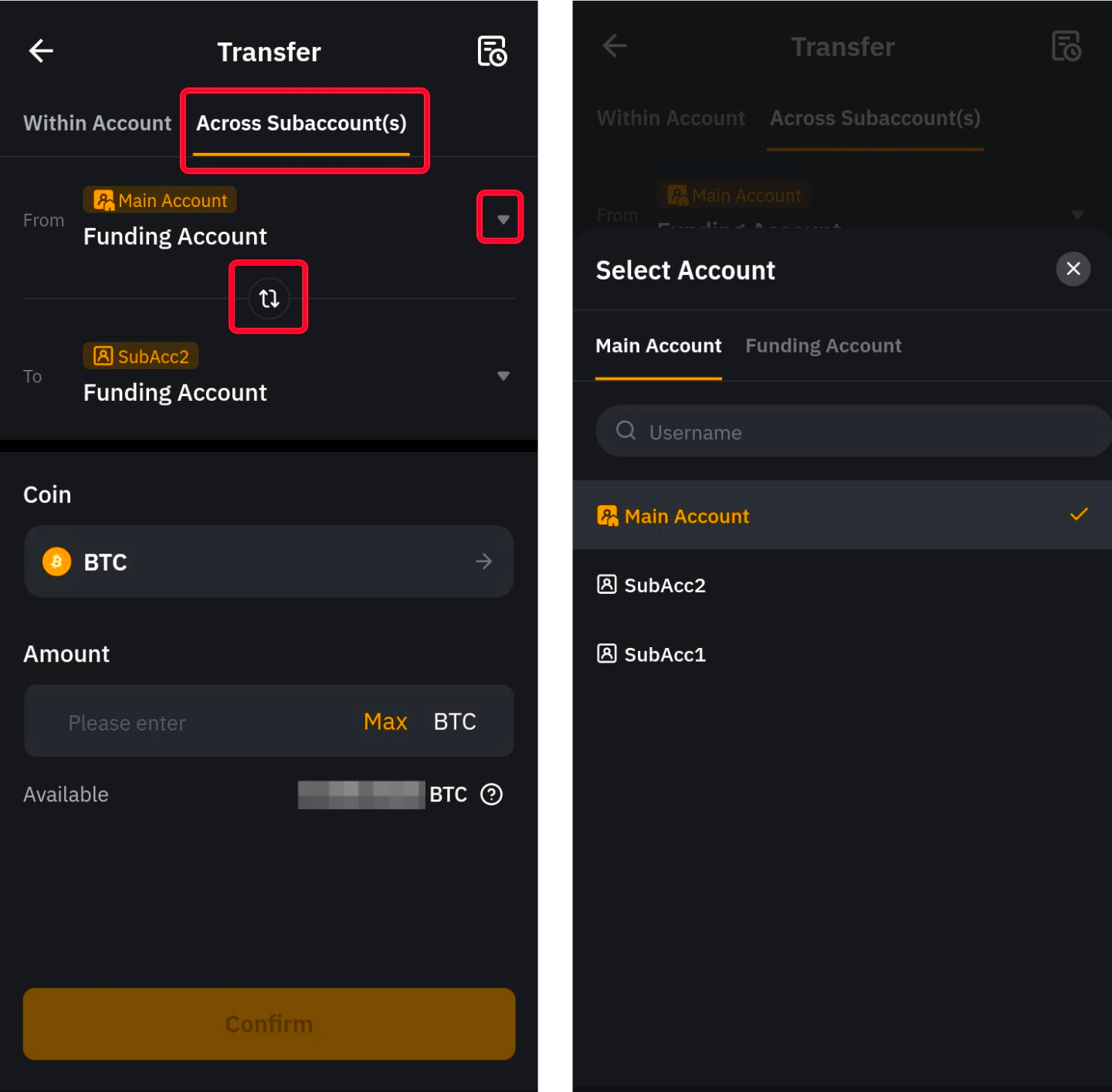 In the Transfer window, switch to Across Subaccount(s) tab to transfer funds across Main and Subaccounts. You can also choose the direction of transfer by clicking on the Switch icon.