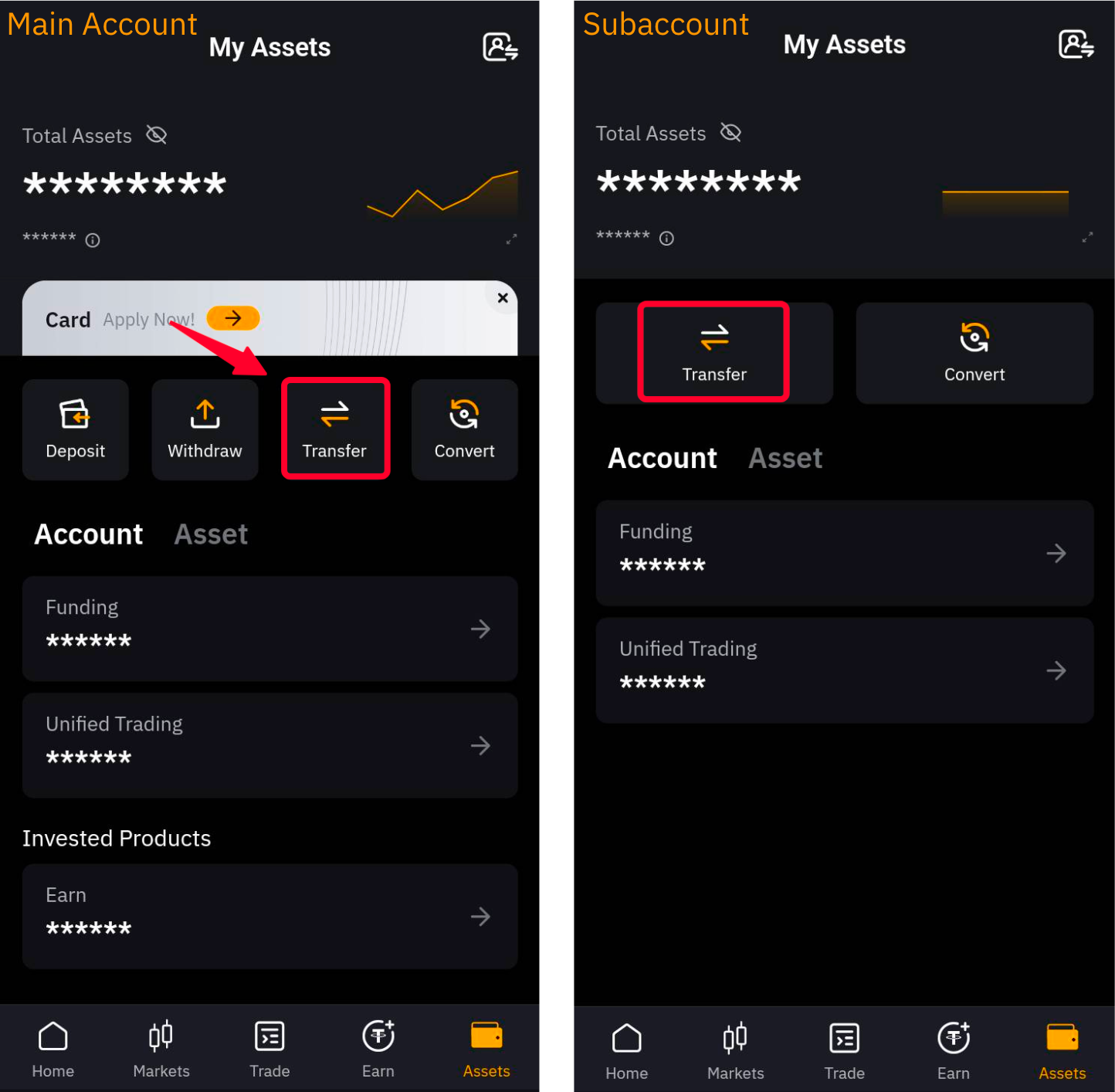 You can click on Transfer on the Subaccount page of your Main Account to transfer assets between any accounts instantly and without any fees.