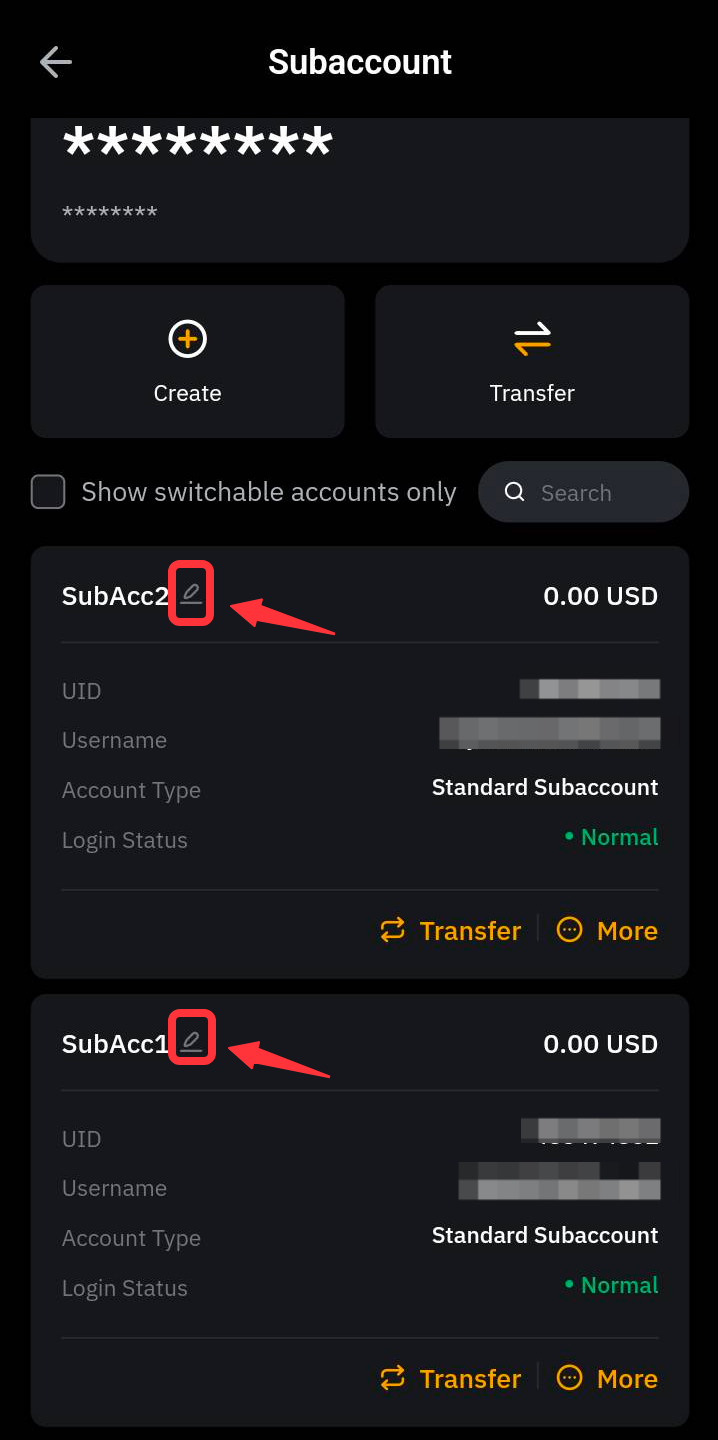 As for the password update, simply go to the relevant subaccount, tap on More → Settings → Login Management and tap on the pencil icon that you see next to your subaccount nickname. You will be requested to indicate your new password and to confirm the update by entering your main account’s 2FA verification code.