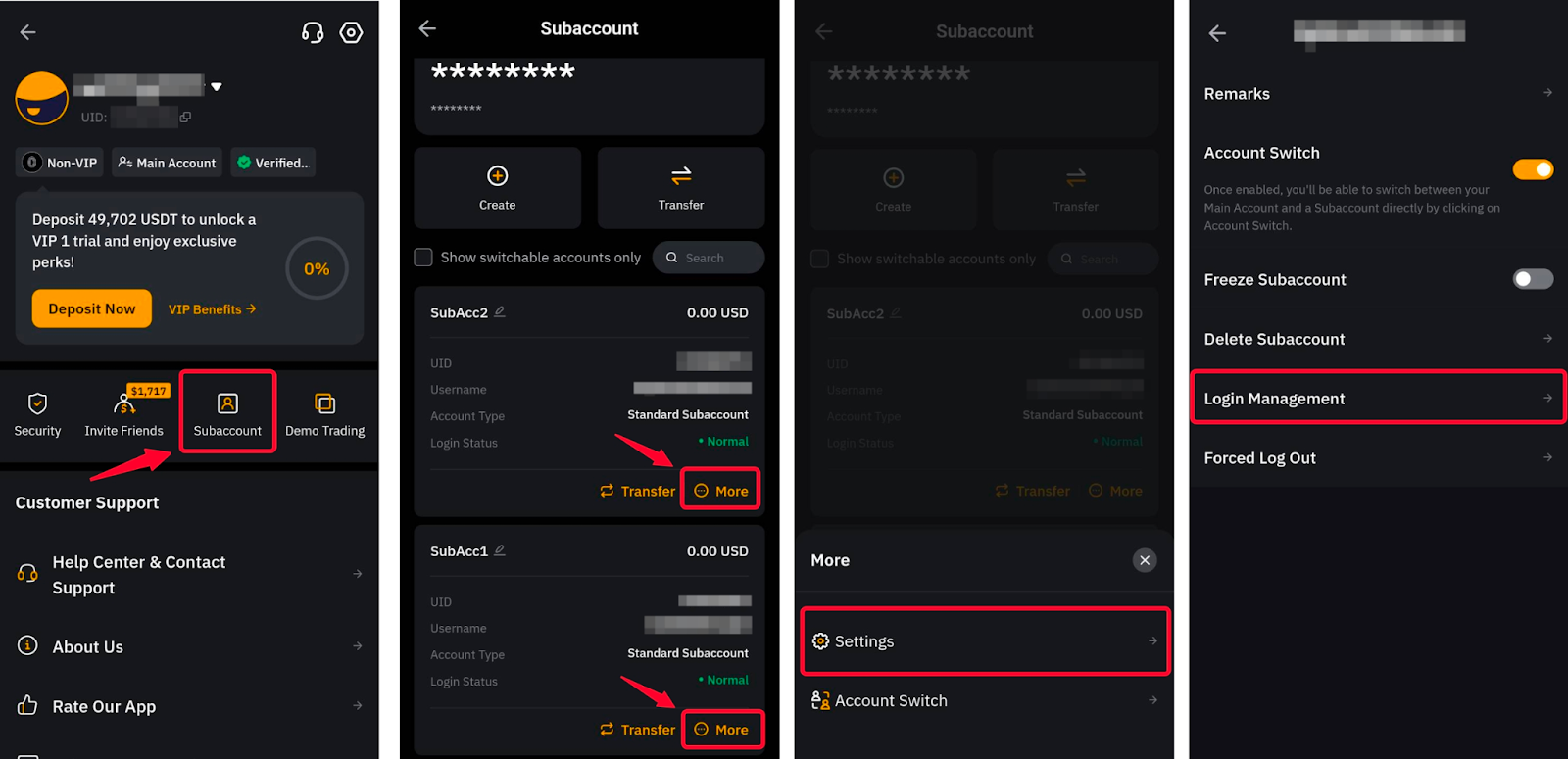 Please note that if you initially created a Standard Subaccount without any password settings, you can only log in via Account Switch from your Main Account. To activate the login via Bybit’s login page, please connect to your main account, and in the Subaccount page, locate your subaccount and tap on More → Settings → Login Management. You can now retrieve your subaccount username and set up a new password.