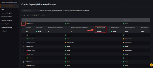 Список минимальных сумм депозитов для каждой монеты доступен на странице «Статус криптовалютного депозита/вывода». Нажмите на раскрывающееся меню рядом с нужной монетой, чтобы узнать минимальную сумму депозита, поддерживаемый блокчейн для внесения средств и информацию, необходимую для успешного зачисления депозита.
