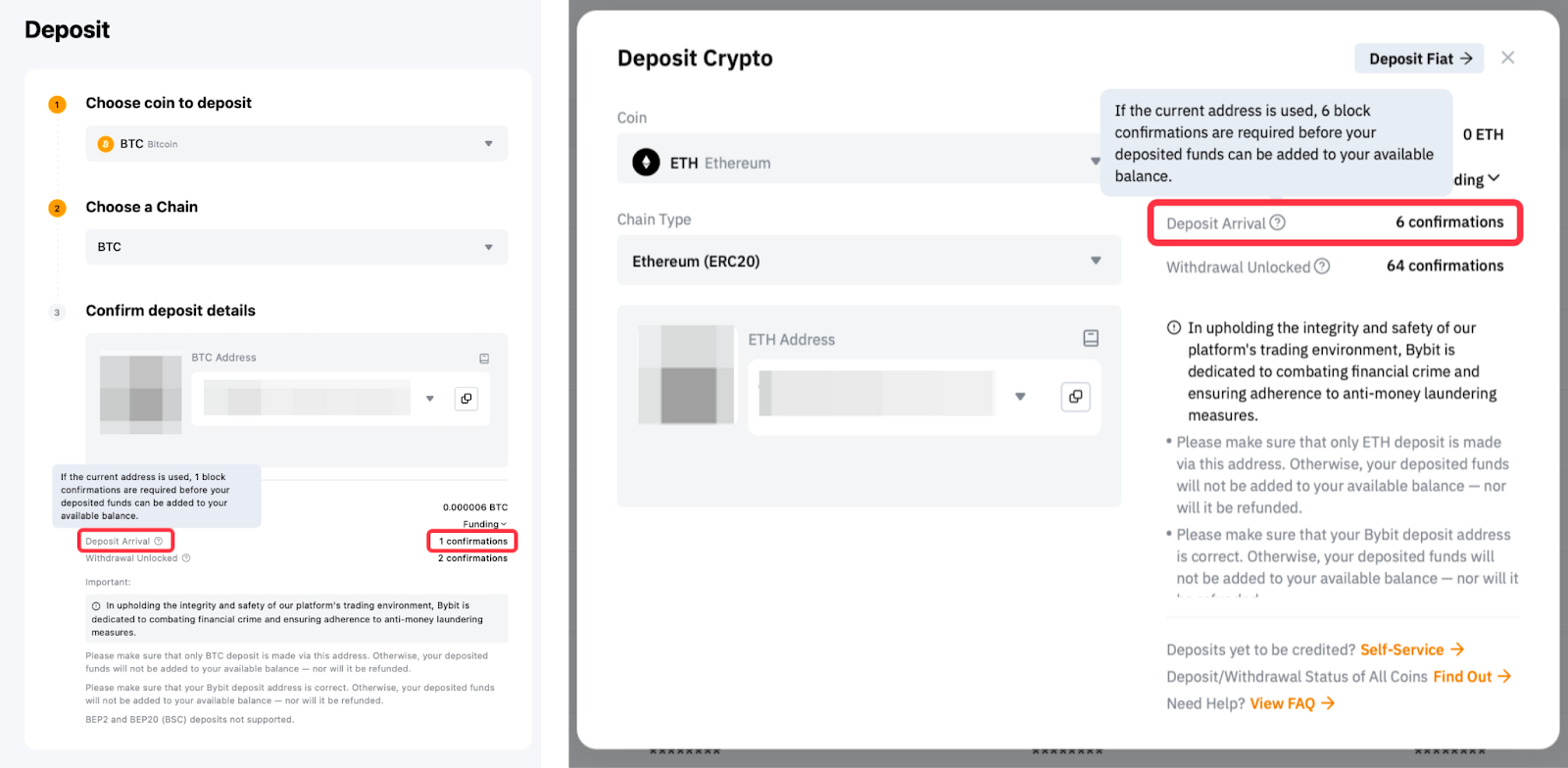 У Bybit есть особые требования к количеству подтверждений в блокчейне по разным монетам для зачисления суммы перевода на аккаунт на Bybit.