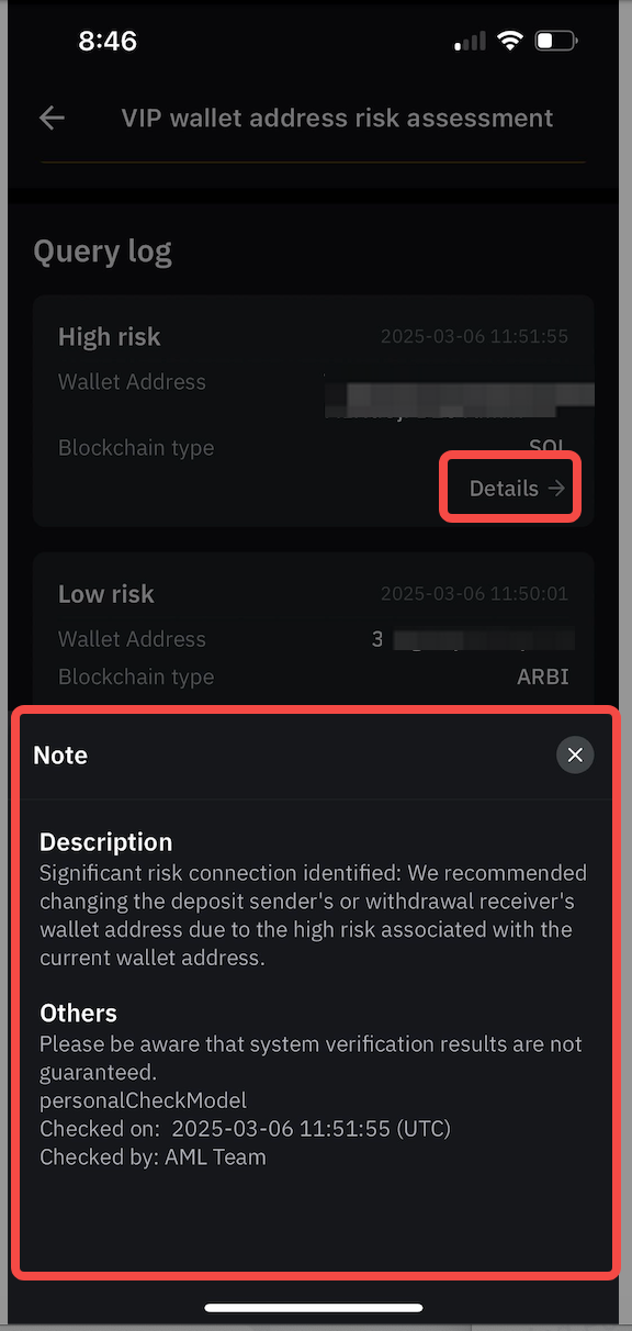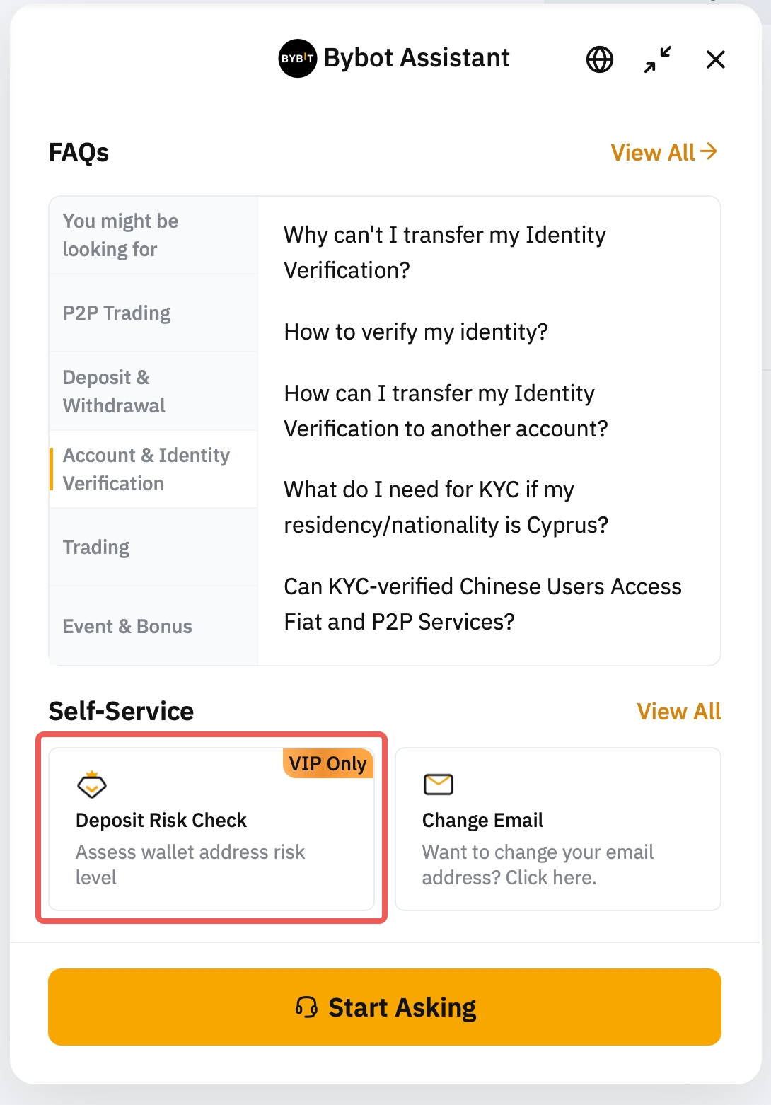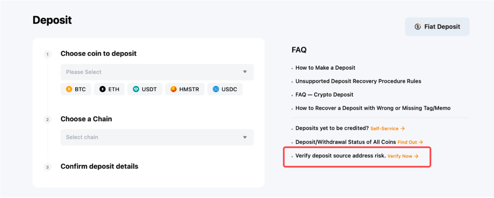 Да. В настоящее время функция оценки риска адреса доступна только VIP-пользователям через бот самообслуживания и страницу депозита. Чтобы воспользоваться функцией, пользователи могут нажать на «Проверьте риск адреса источника депозита».