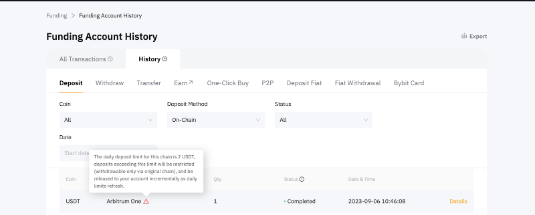 На платформе Bybit действуют ежедневные лимиты депозитов для каждого конкретного блокчейна. Депозиты, превышающие этот лимит, временно останутся активами, которые нельзя использовать в торговле, и их можно просмотреть в разделе «Активы, ожидающие перевода» на странице «Аккаунт финансирования».