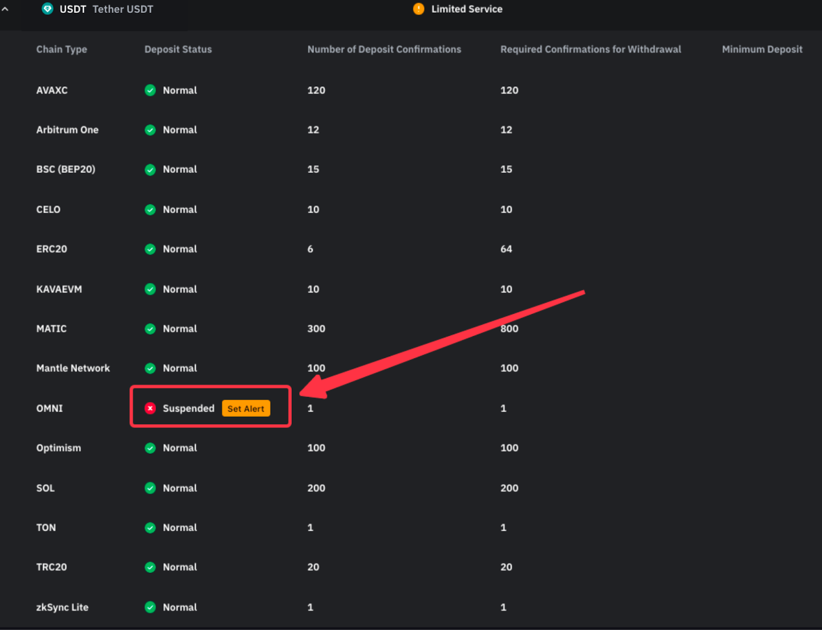 Также можно перейти на страницу статуса депозита/вывода и найти токен и сеть. Кнопка «Установить оповещение» будет отображаться рядом со статусом депозита «Приостановлено».