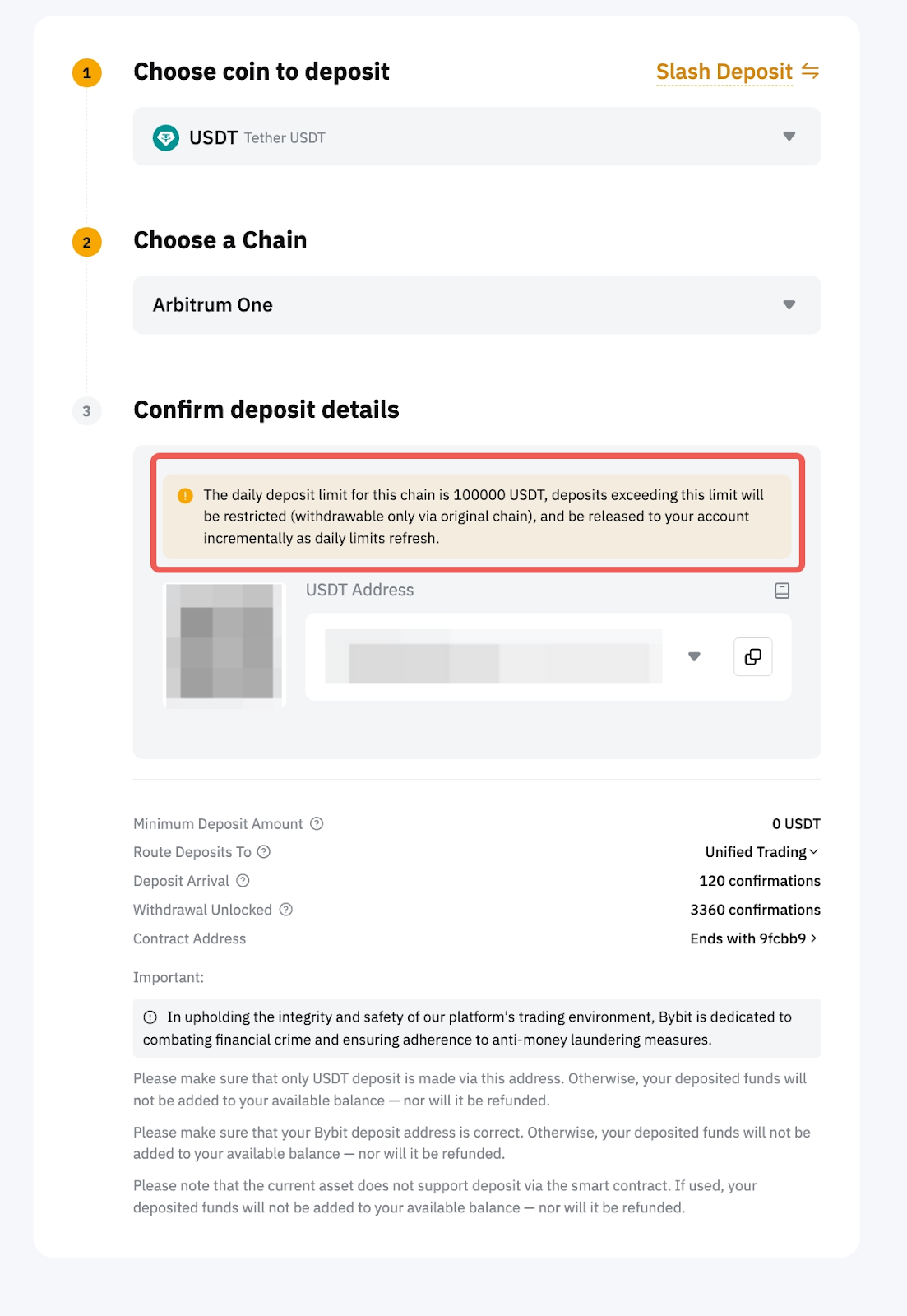 Например, лимит депозита для USDT через Arbi Chain составляет 100 000 USDT, а общий размер активов, ожидающих перевода, составляет 300 000 USDT. 300 000 USDT будет переведены на аккаунт в течение трёх дней, по 100 000 USDT в день.