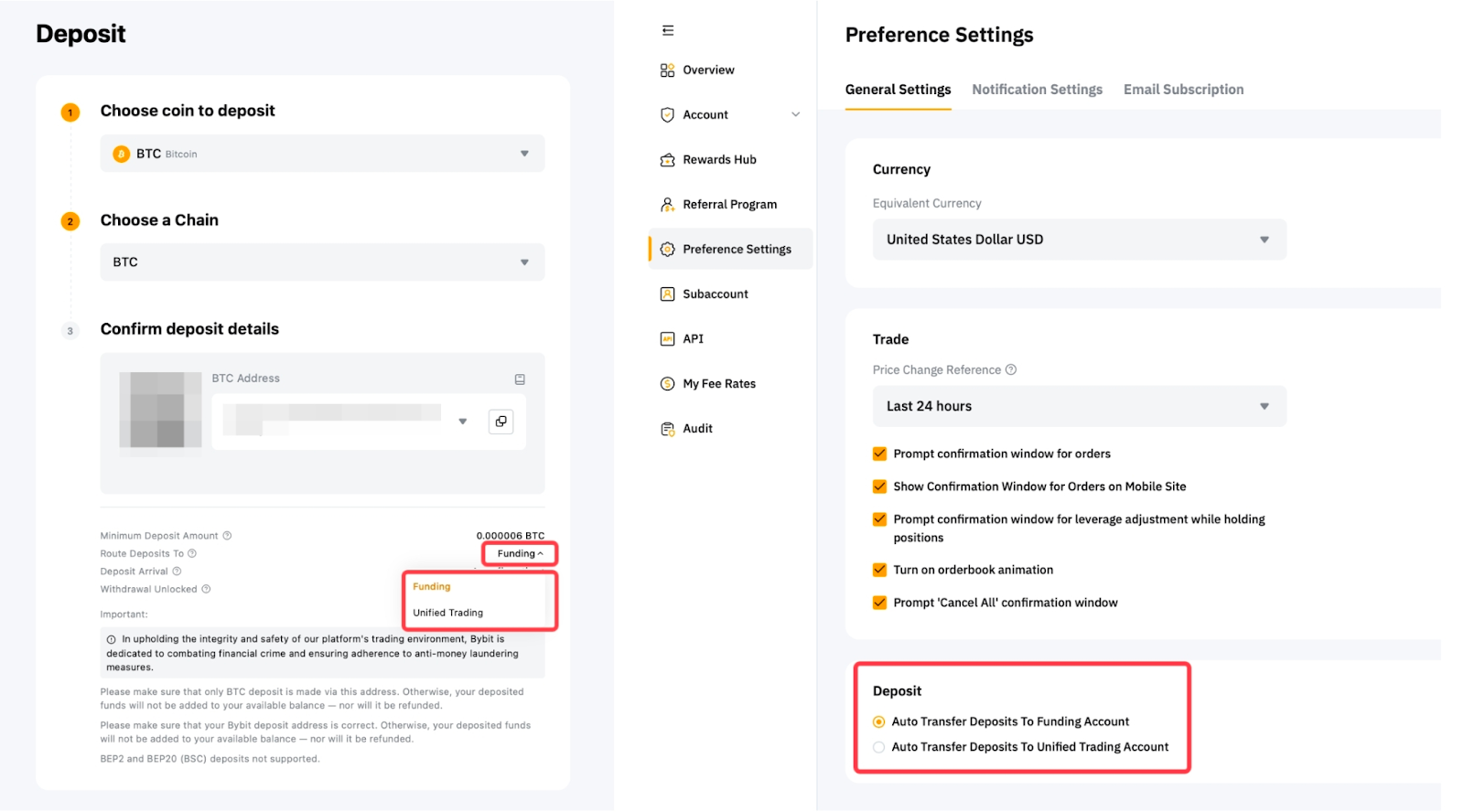 Назначение для депозита по умолчанию — Аккаунт Финансирования. Тем не менее вы можете изменить место назначения депозита на свой Единый Торговый Аккаунт на странице депозита или на странице настроек.