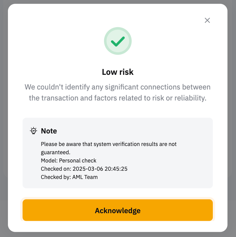 После ввода адреса кошелька и выбора типа блокчейна система оценит уровень риска для вас. Однако обратите внимание, что результаты верификации системы не гарантируются из-за данных блокчейна, которые могут быть устаревшими или подвергаться развивающимся угрозам.