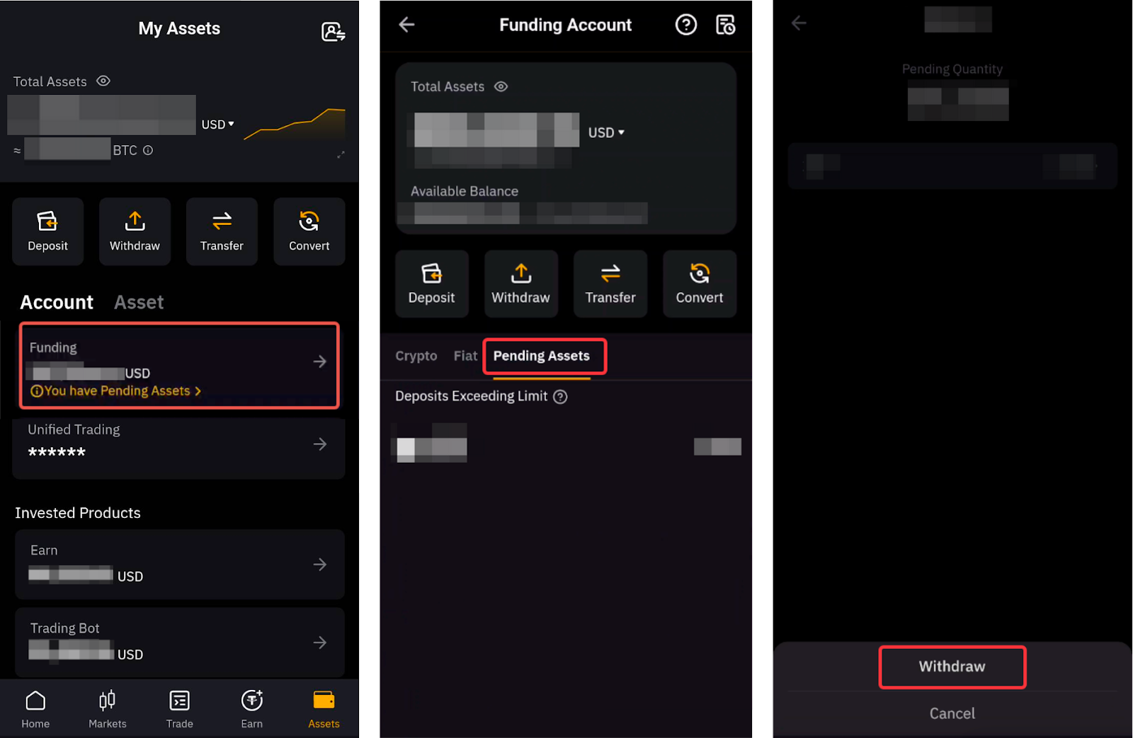 В приложении перейдите в раздел Активы → Финансирование → Ожидающие активы, выберите монету и нажмите Вывести.