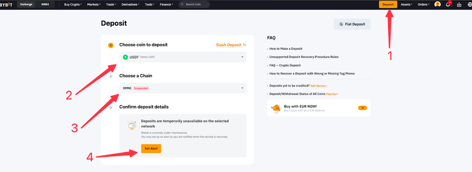 Вход в раздел с депозитами также можно найти в правом верхнем углу на странице Bybit.