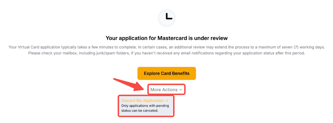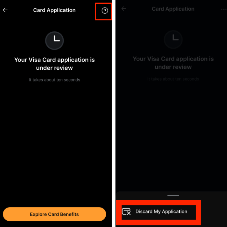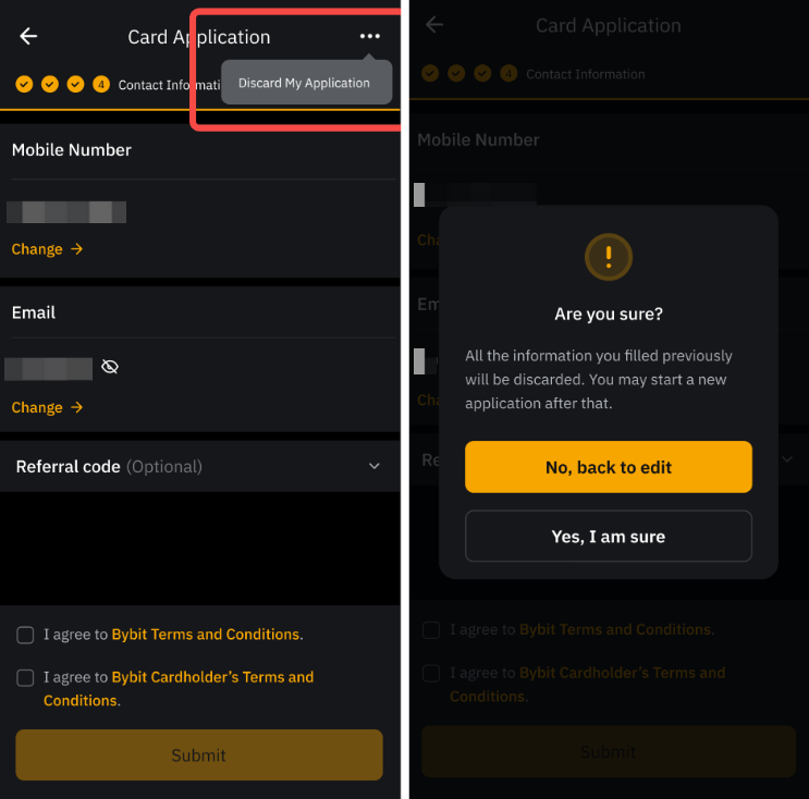 Вы можете отменить заявку на карту Bybit , нажав Просмотреть мою заявкуДополнительные действия и выбрав Отменить мою заявку на карту.