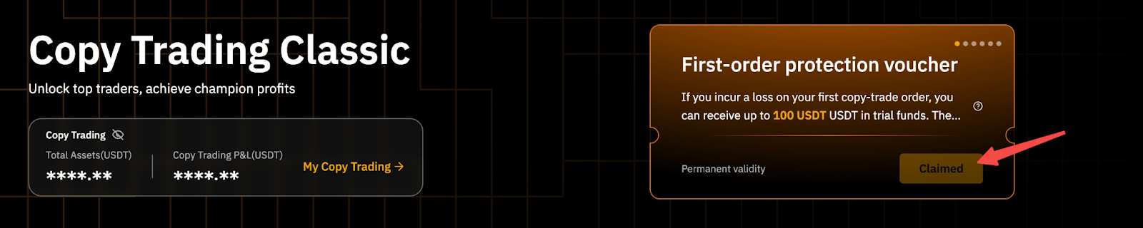 - Он предоставляет до 100 USDT в виде бонуса в Копитрейдинге в качестве компенсации убытков, понесенных по соответствующим ордерам Копитрейдинга.