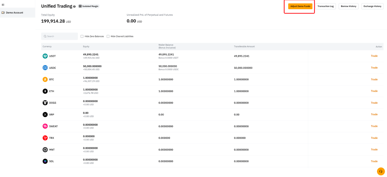 Поскольку для демо-трейдинга используется Единый торговый аккаунт (ЕTA), он поддерживает функции торговли на споте и деривативах.