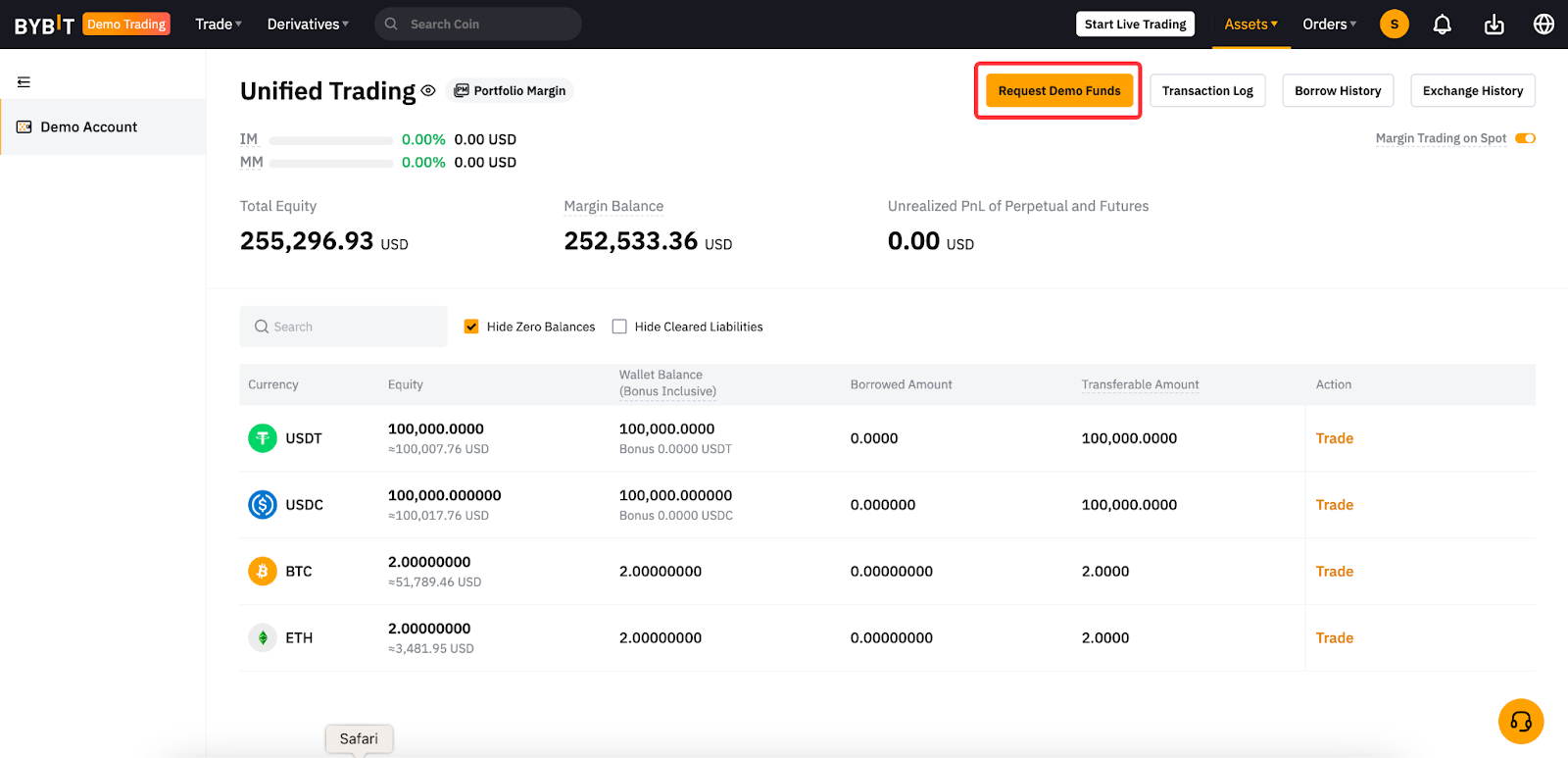 После инициализации демо-аккаунта Bybit пользователи автоматически получают виртуальные активы в размере 50 000 USDT, 50 000 USDC, 1 BTC и 1 ETH. Вам не нужно запрашивать средства вручную.