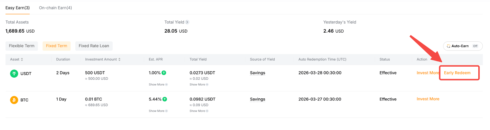 Если продукт поддерживает досрочный вывод, вы можете найти опцию Досрочный вывод на странице позиции Easy Earn и следовать инструкциям на экране, чтобы продолжить.