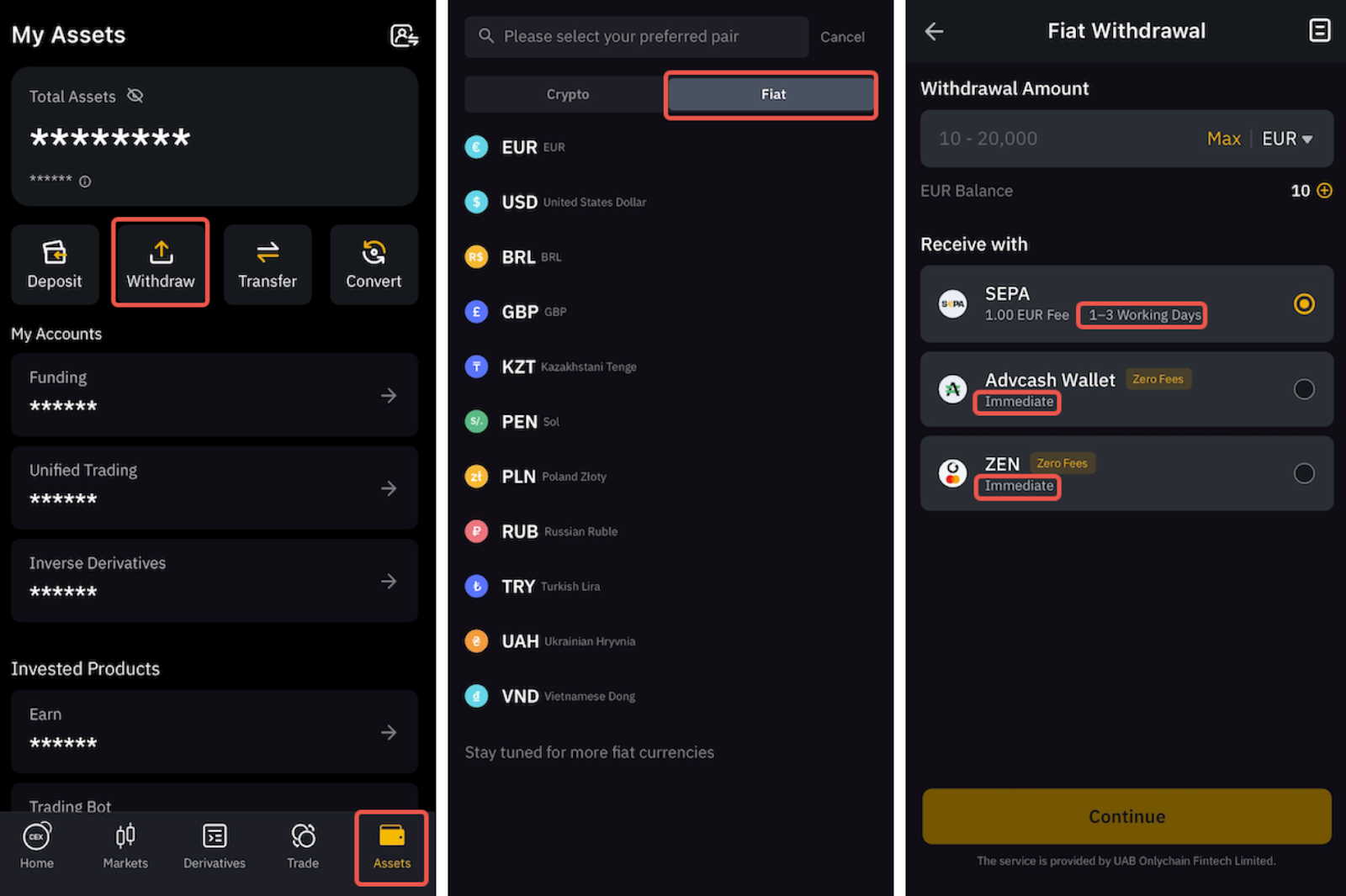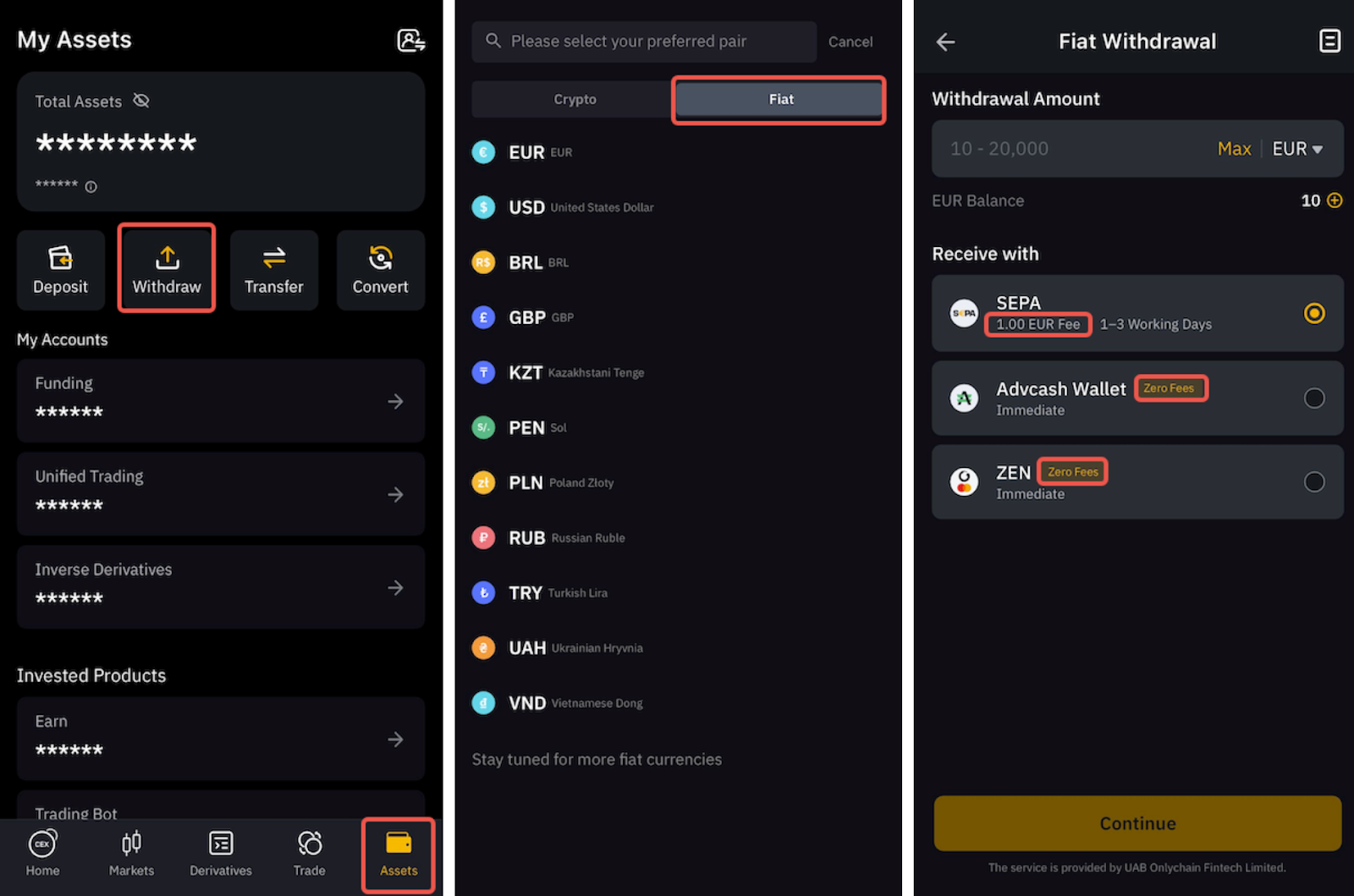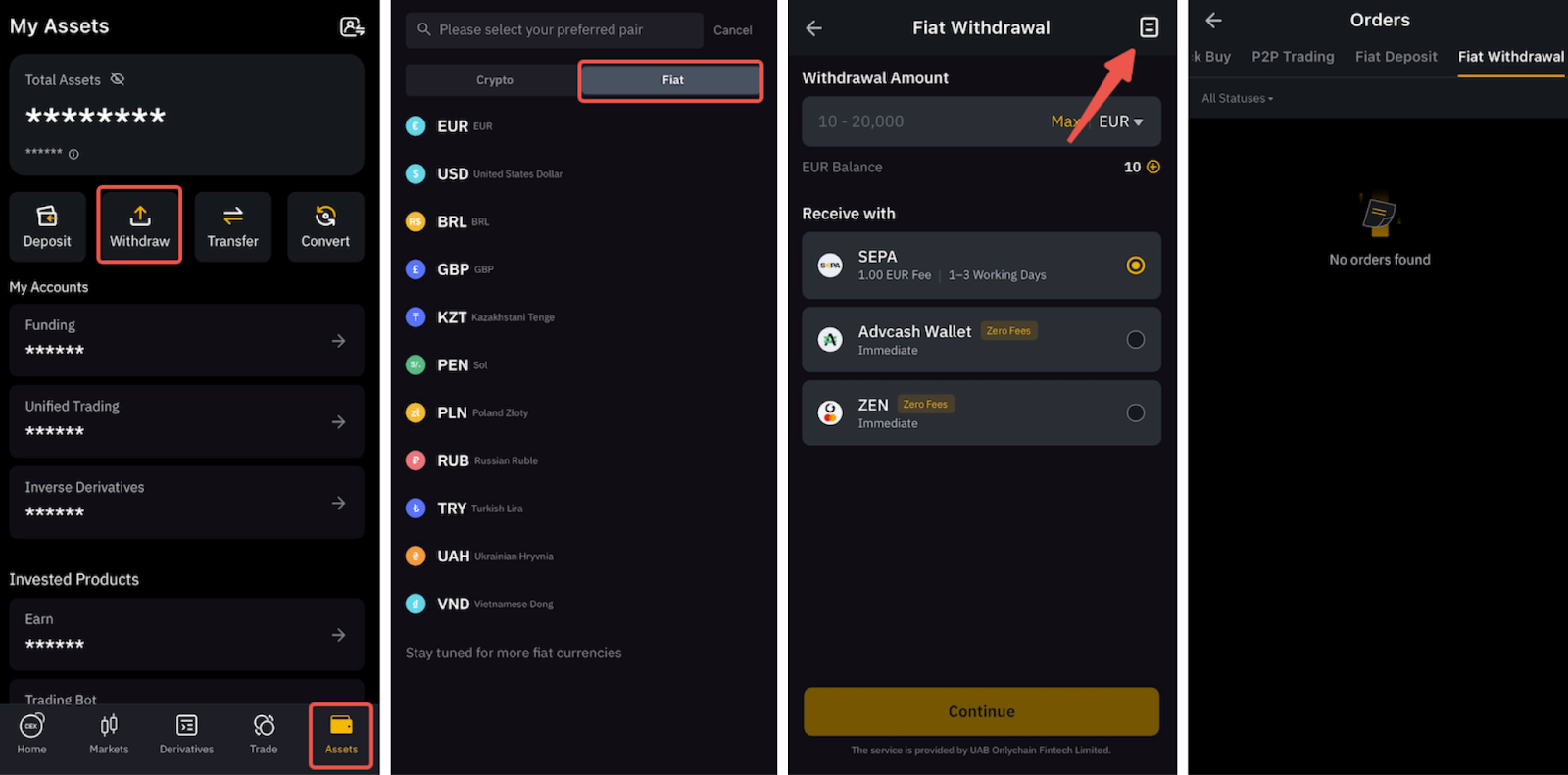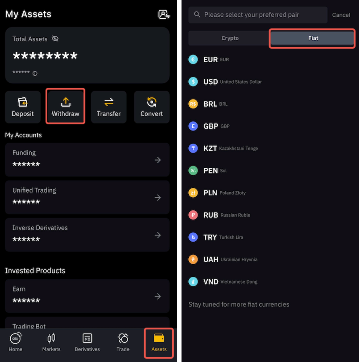 Чтобы узнать больше о том, как вывести фиатную валюту, ознакомьтесь с доступными статьями для каждой валюты здесь.