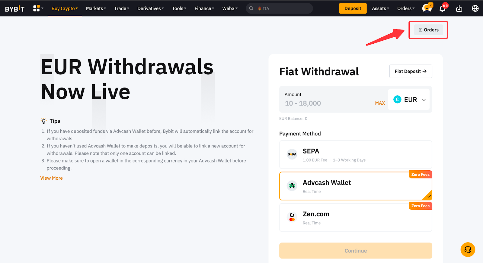 Чтобы открыть историю выводов, перейдите в раздел Ордера в правой верхней части навигационной панели на сайте Bybit.