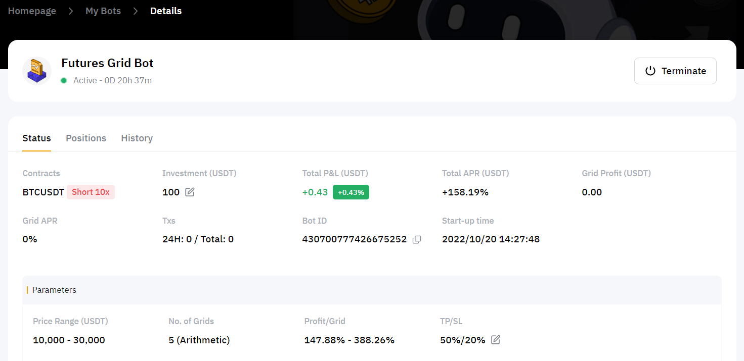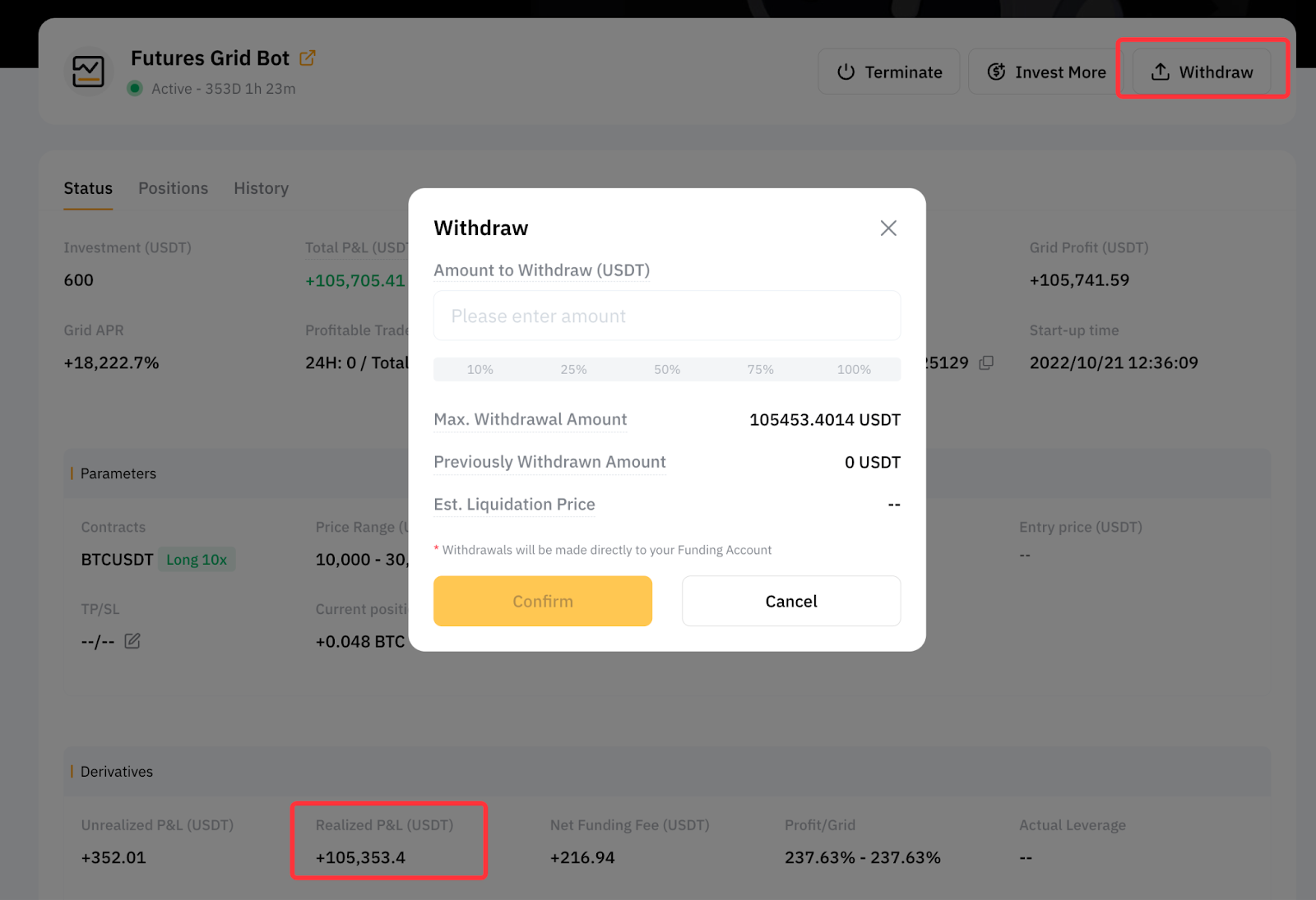 Во время работы grid-бота вся прибыль будет оставаться внутри бота. После прекращения работы бота сумма инвестиций и прибыль будут автоматически переведены на ваш аккаунт Финансирования.