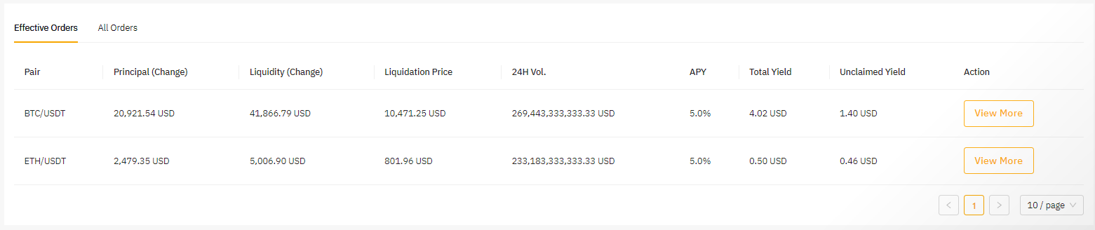 Активные ордера: вы можете просмотреть подробную информацию об активных ордерах, включая пару, основную сумму (изменение), ликвидность (изменение), цену ликвидации, APY, общий доход, доход к получению и многое другое.