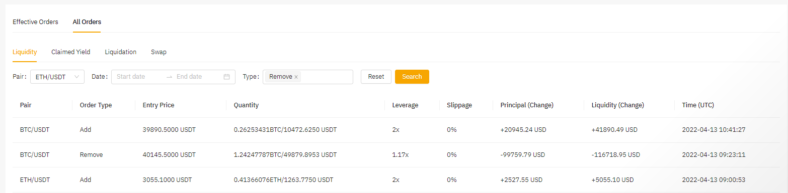 Все ордера: вы можете просмотреть подробную информацию в следующих категориях: ликвидность, полученный доход, ликвидация, обмен, пара, дата и тип.