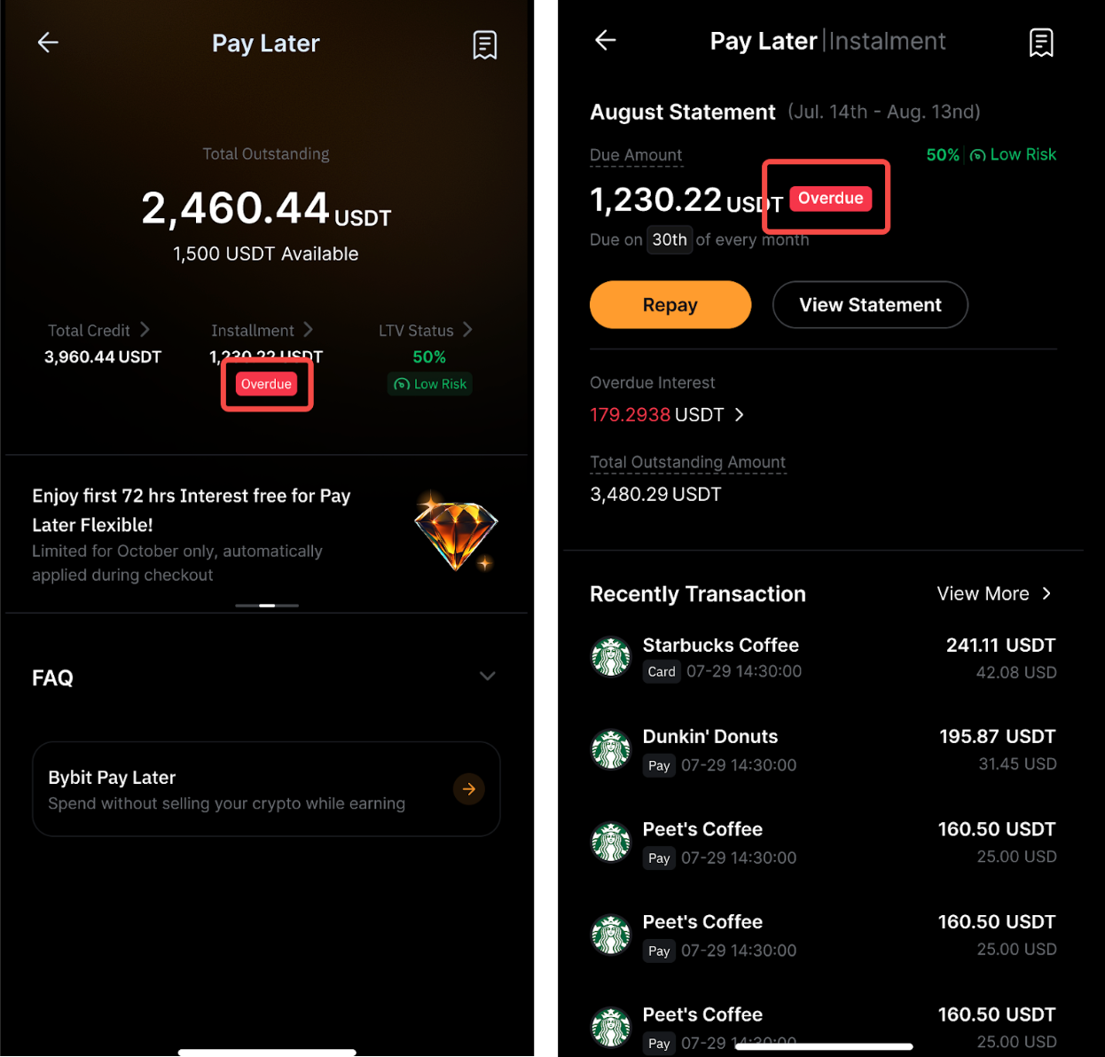 Вы увидите этикетку просроченной оплаты на странице Bybit Pay, Оплата позже и странице Выписка.