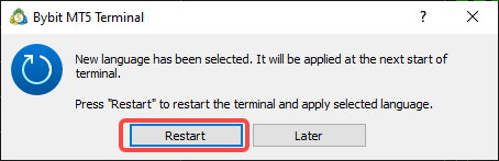 После этого появится диалоговое окно с предложением перезапустить терминал. Нажмите Перезапустить, и после открытия клиентского терминала MT5 будут применены новые языки.