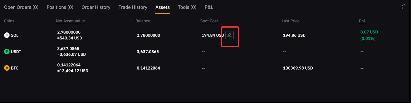 Шаг 1. Прокрутите страницу до раздела Активы и нажмите на значок редактирования рядом с отображаемым значением спотовой стоимости.