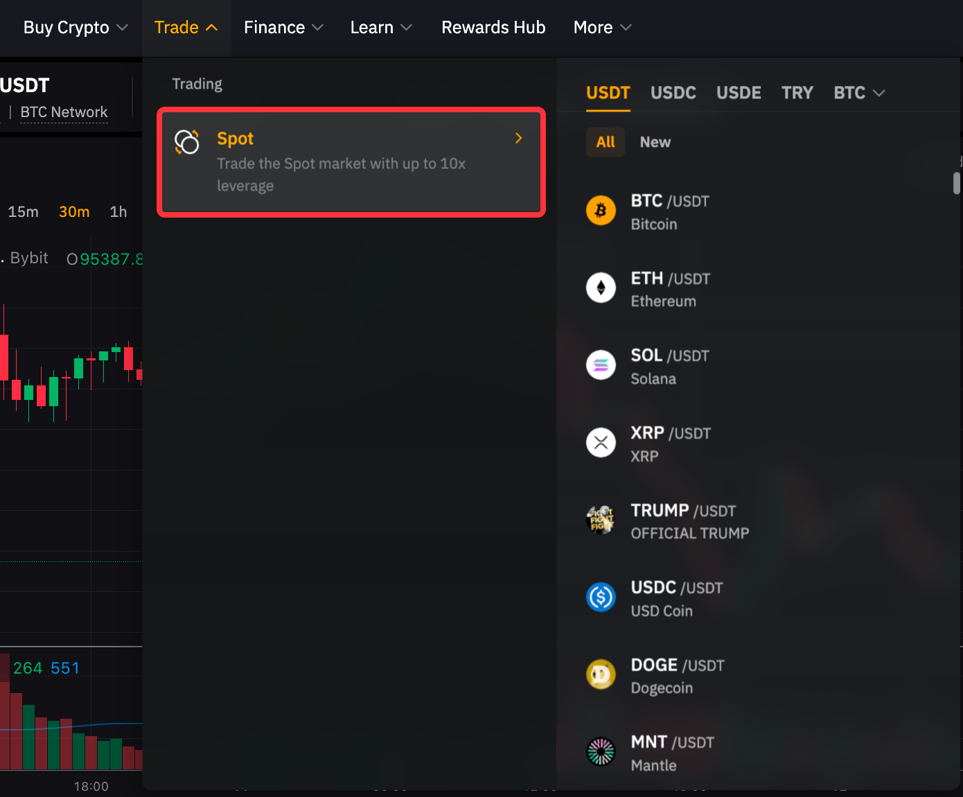 Шаг 1. Войдите в аккаунт и нажмите Торговать Спот на верхней панели навигации, чтобы открыть страницу спотовой торговли.