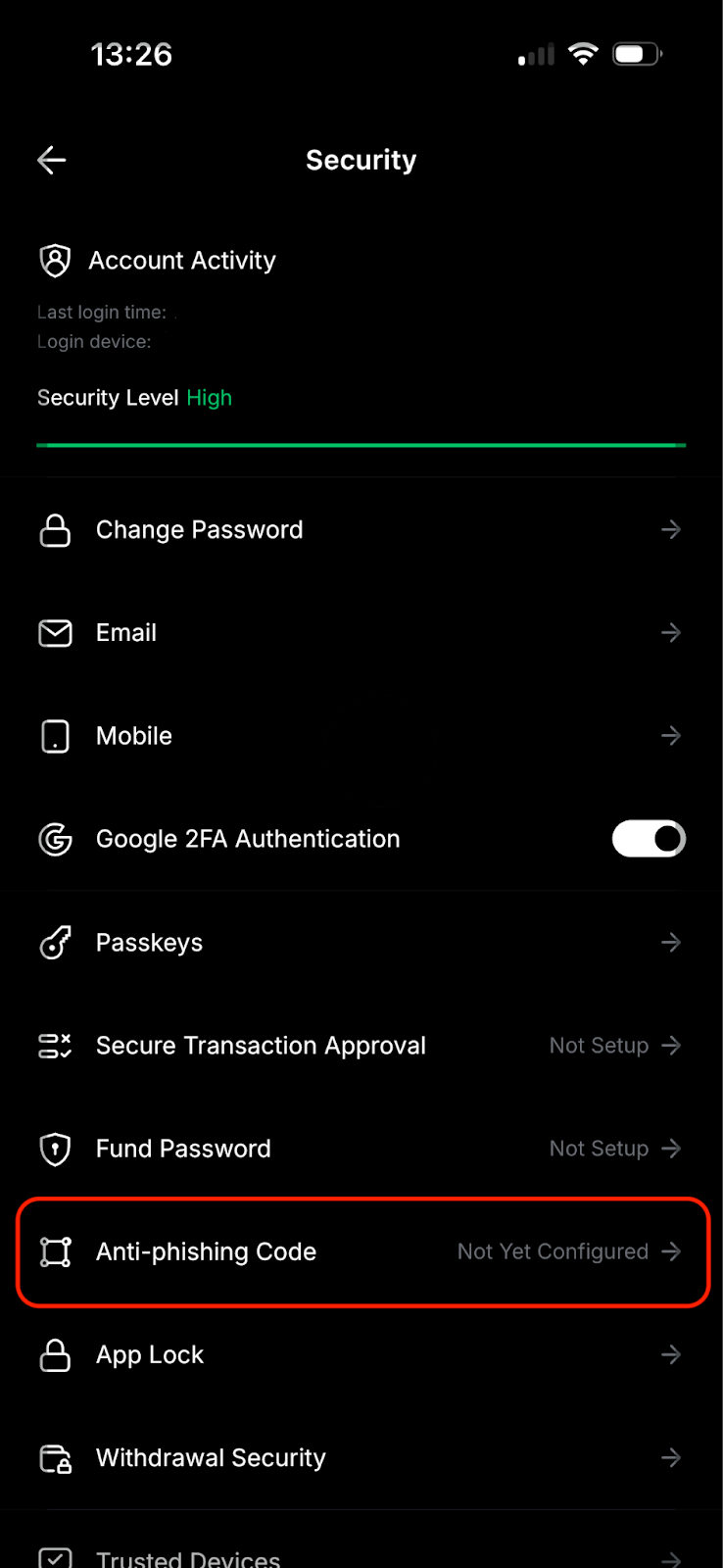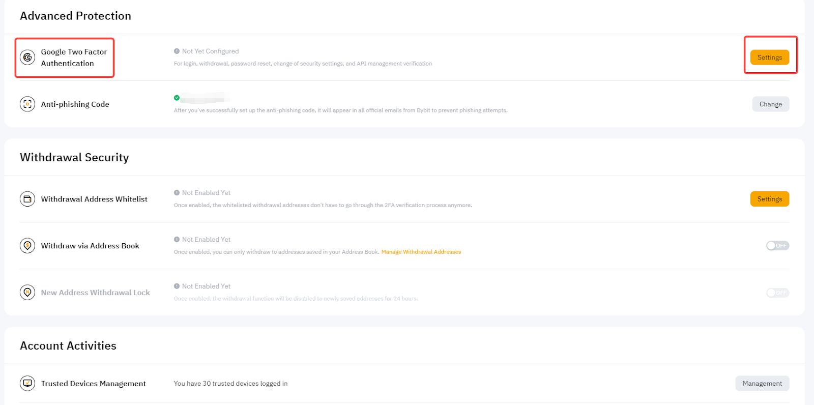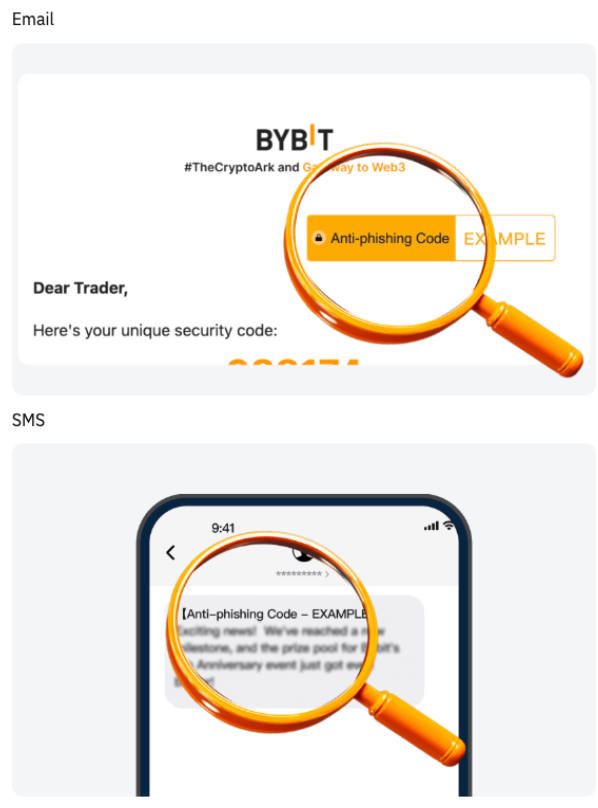 Чтобы снизить риск фишинга, Bybit настоятельно рекомендует настроить код защиты от фишинга через веб-сайт или мобильное приложение. Если вы ещё не активировали антифишинговый код, перейдите на страницу Аккаунт и безопасность и следуйте этому руководству.