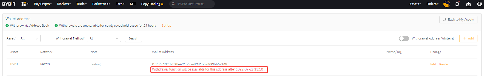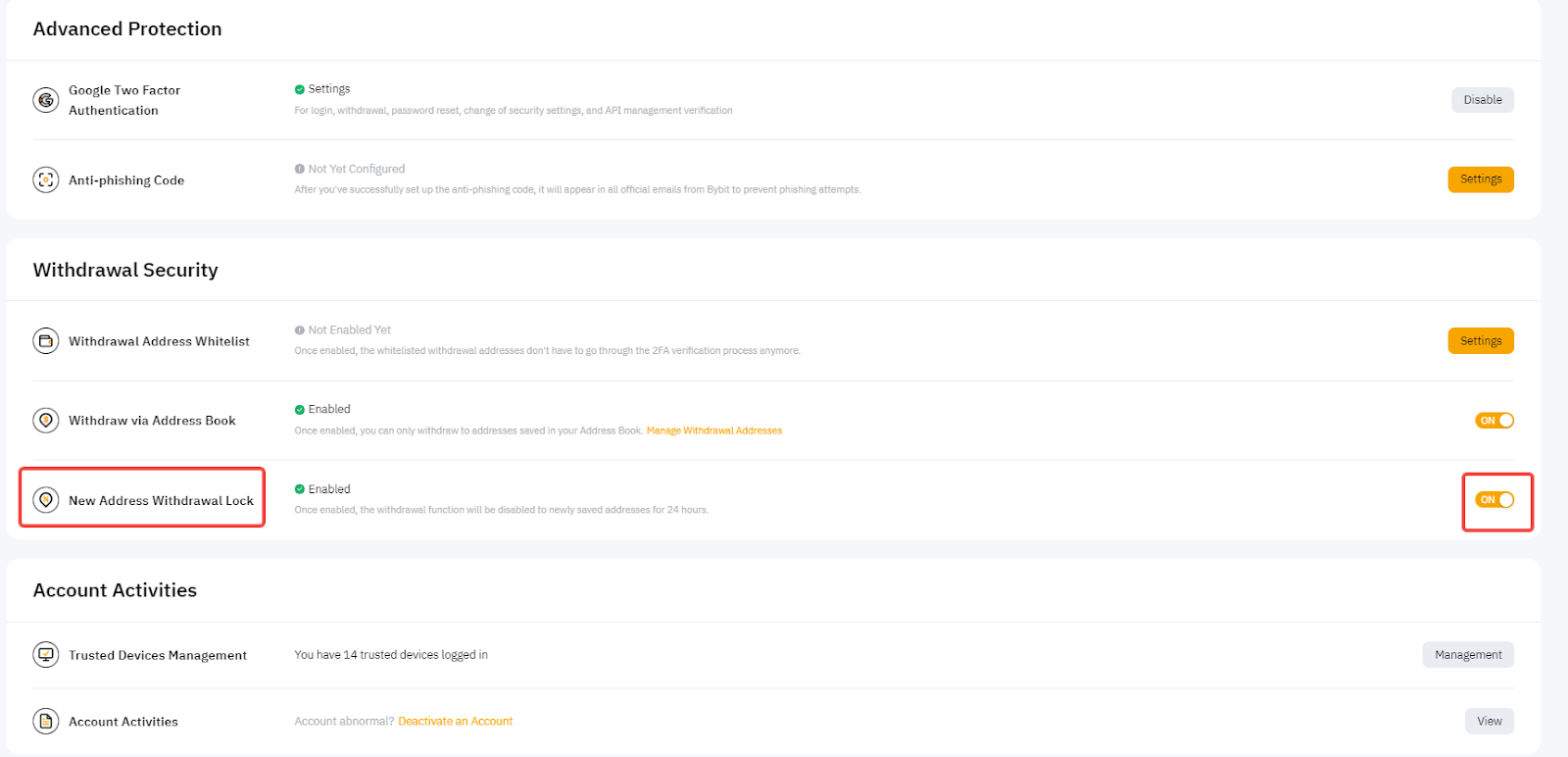 После активации этой функции вывод средств на новые адреса будет недоступен в течение следующих 24 часов. Пожалуйста, перейдите на эту страницу, чтобы узнать, как управлять адресной книгой для вывода.