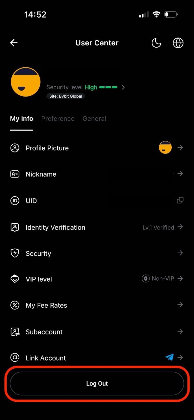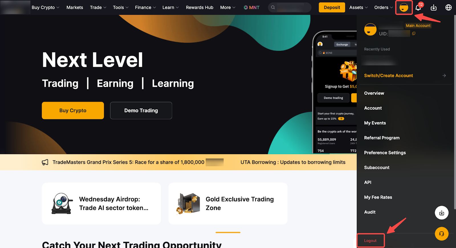 Чтобы выйти из учётной записи Bybit в приложении, перейдите в Центр пользователя и нажмите кнопку «Выйти». На веб-сайте нажмите значок профиля в правом верхнем углу (шаг 1), затем — кнопку «Выйти» (шаг 2).